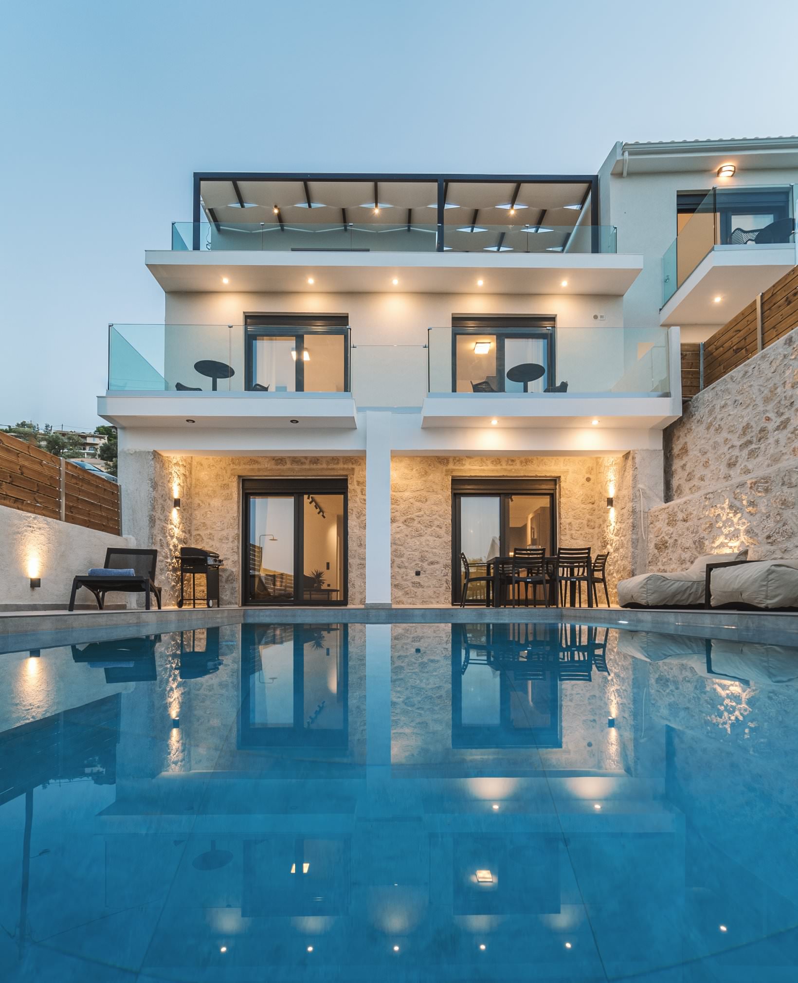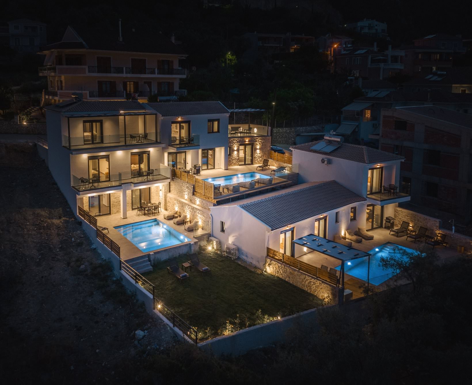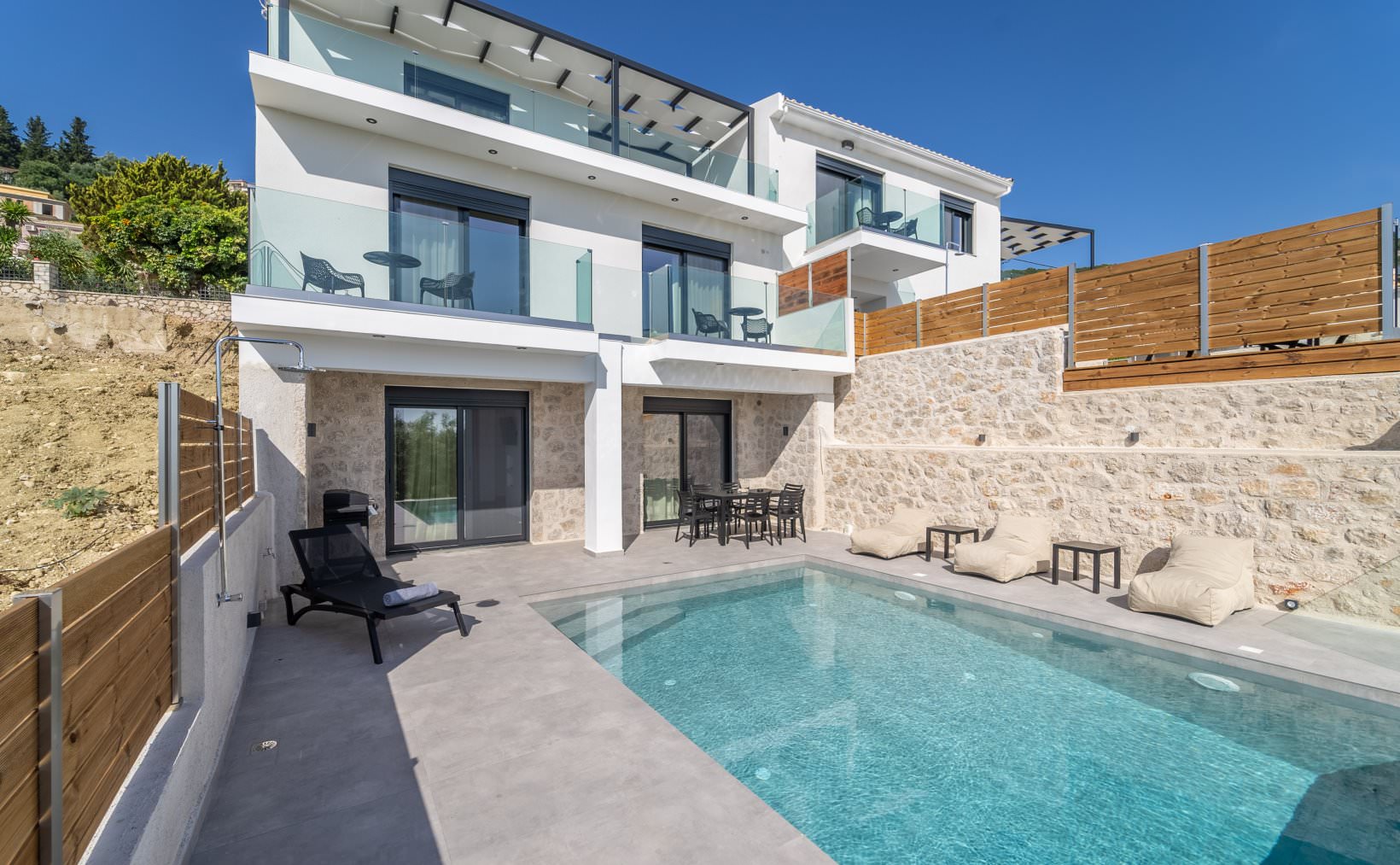 מתחם יוקרה חדש של 3 וילות סמוכות, עצמאיות, ופרטיות לחלוטין. נבנה ומאופיין בצבע לבן, עץ ואבן.