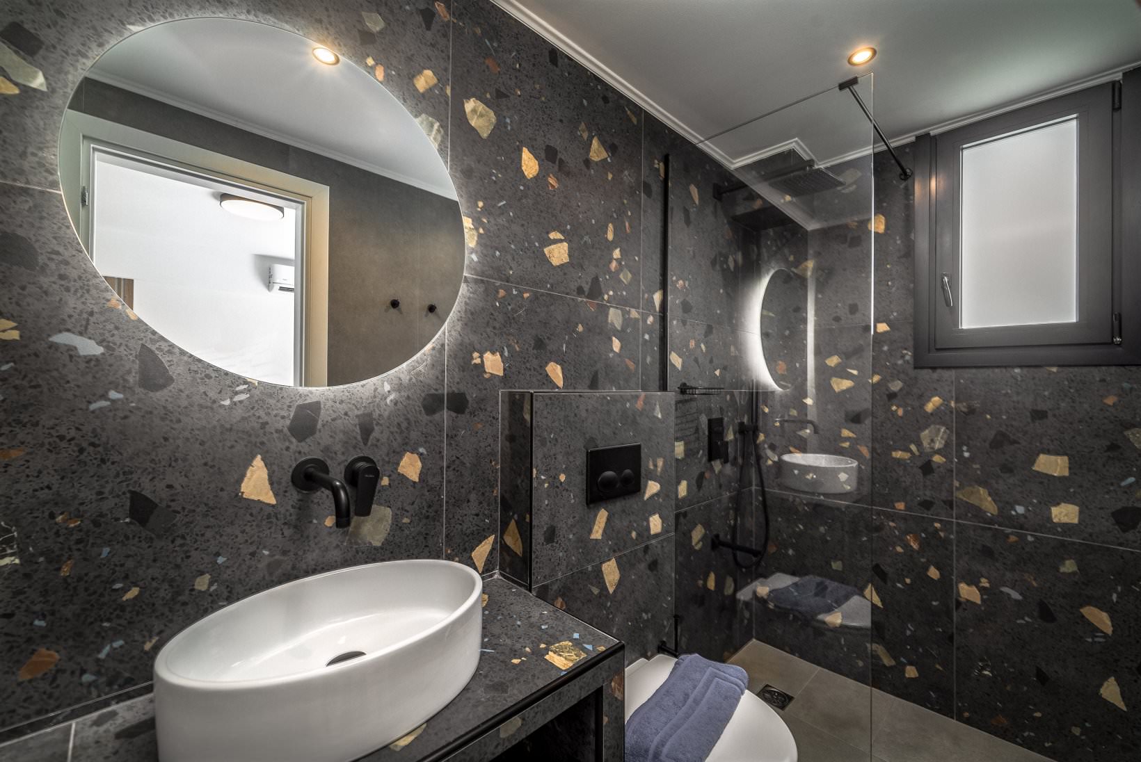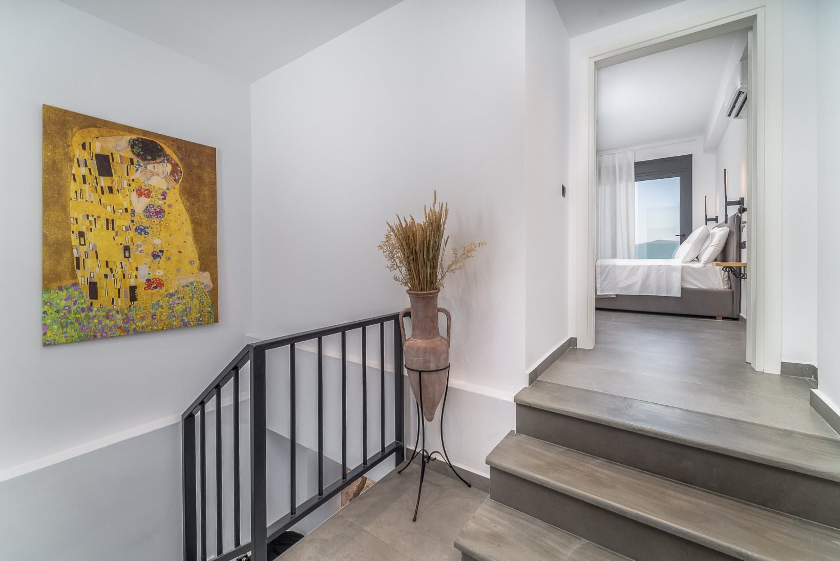 גרם המדרגות הפנימי משיש מוביל לקומה הראשונה: שני חדרי שינה מרווחים, כל אחד עם חדר רחצה משלו , מרפסת הגדולה. למעלה ומתחת לפרגולה המוצלת אפשר ליהנות מנוף העיר בישיבה בטרקלין הנוח.