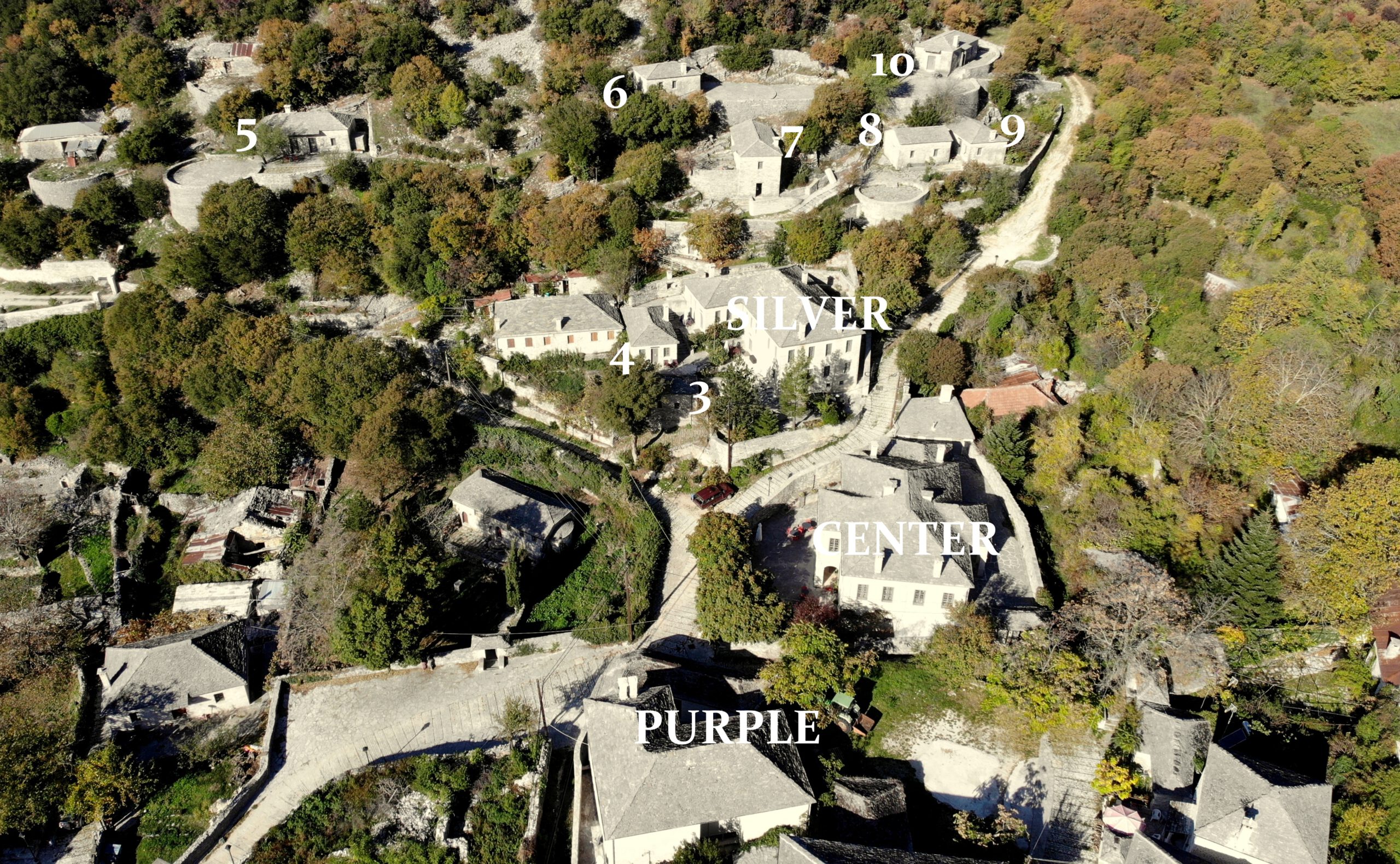 בית ההארחה מורכב משלושה מבנים מרכזיים ושבעה דירות סטודיו השוכנות על אחת מחמש הגבעות המקיפות את הכפר. בשניים מהבניינים המרכזיים יש שבעה חדרים, בבניין השלישי נמצאים המסעדה לארוחת הבוקר iמתקני הכנסים.
