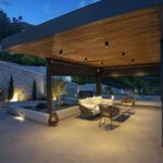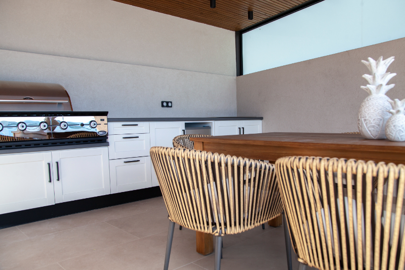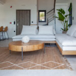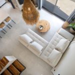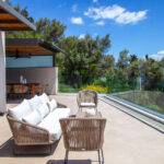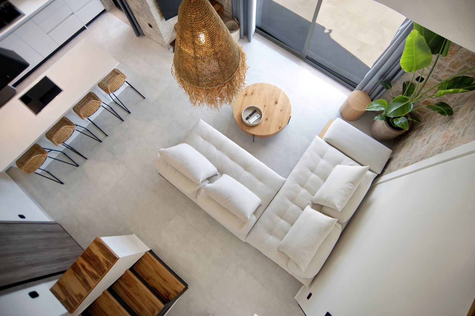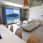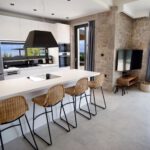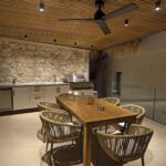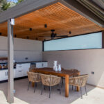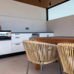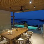 כניסה לווילה לחלל המגורים גדול מואר באור שמש טבעי עם דלתות חלונות המעניקות גישה ישירה לבריכה הפרטית החיצונית ולפינת האוכל.