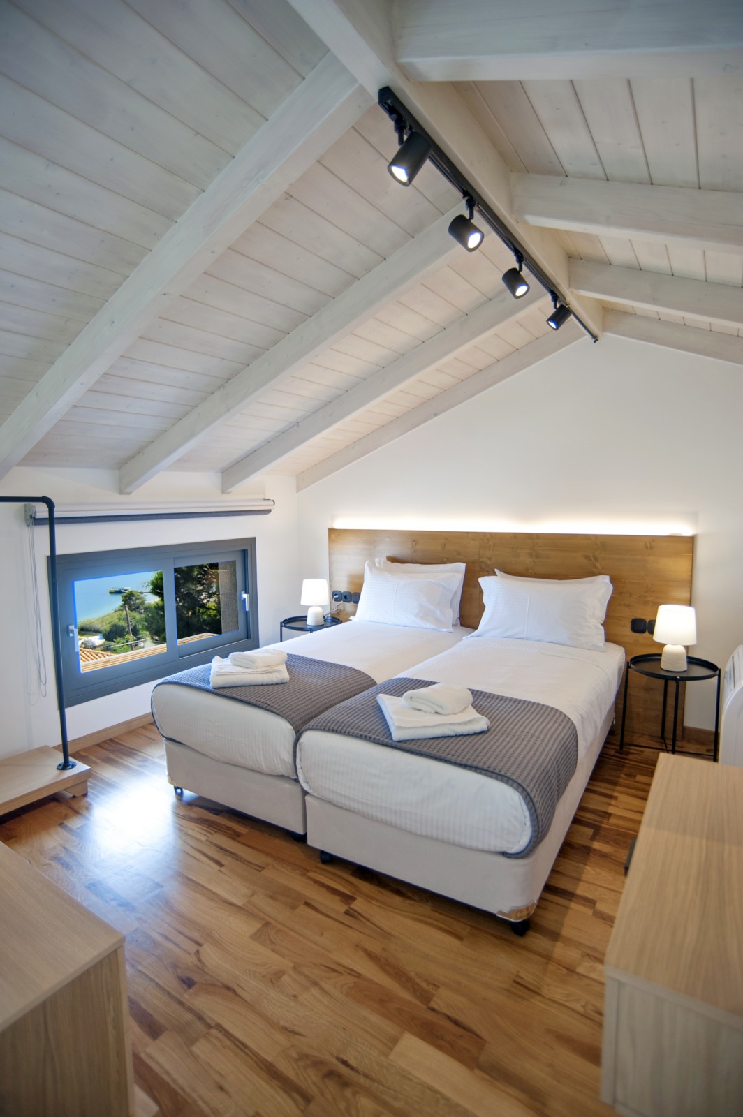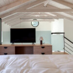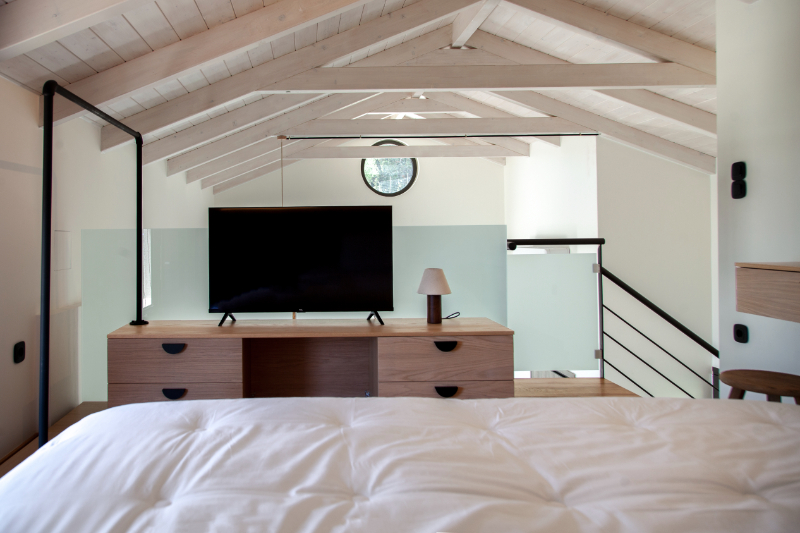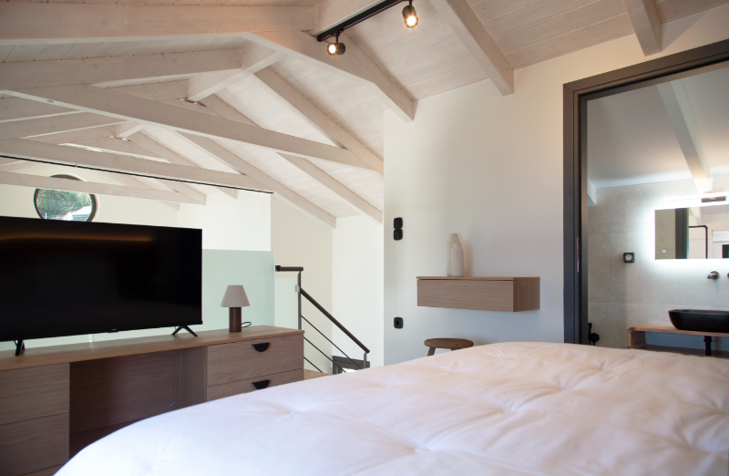 דרך גרם מדרגות פנימי, למפלס העליון: חדר שינה לופט זוגי מדהים עם חדר רחצה צמוד.