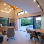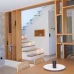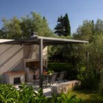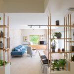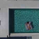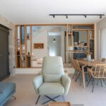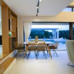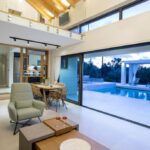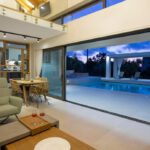 The outdoor space combines 2 designed seating areas on different levels with a rectangular shaped swimming pool located right in front of the living room.