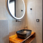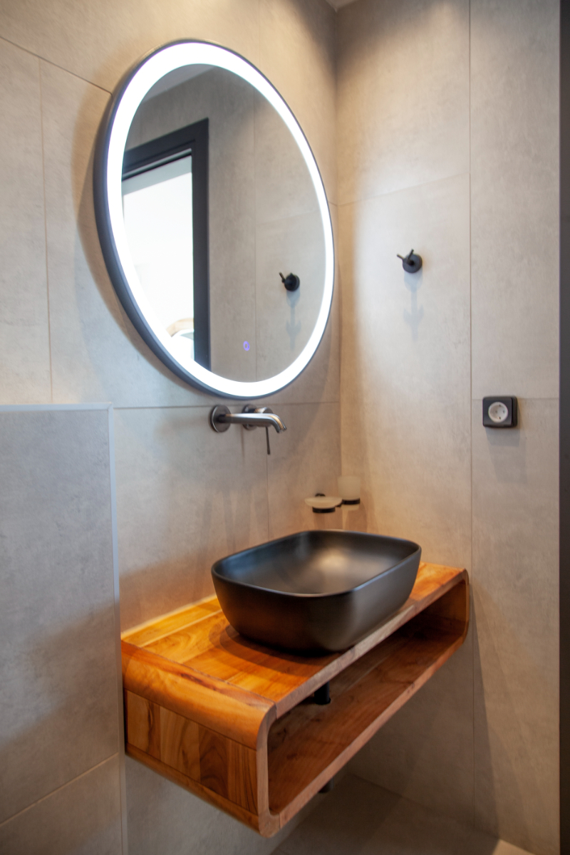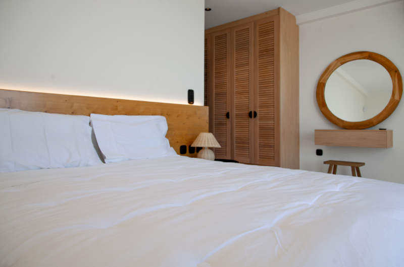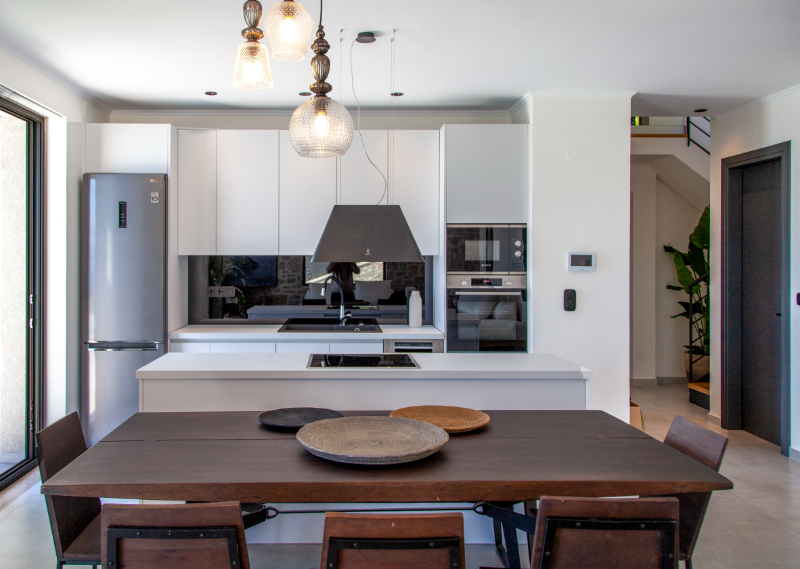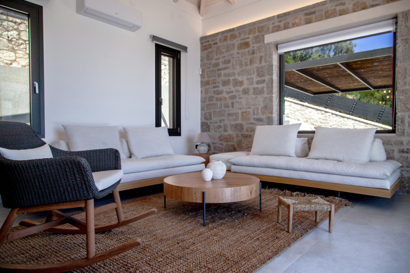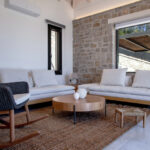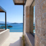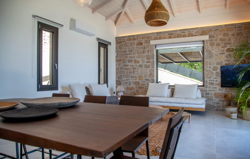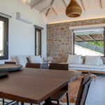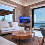 העיצוב העכשווי של הוילה מנצל את המיקום הפנורמי על צלע ההר, דלתות הזזה גדולות מזכוכית הנפתחות לבריכה החיצונית, מציפים את חללי הפנים באור טבעי ויוצרים חווית נופש יוונית יוקרתית .