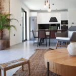 כניסה לווילה לחלל המגורים גדול מואר באור שמש טבעי עם דלתות חלונות המעניקות גישה ישירה לבריכה הפרטית החיצונית ולפינת האוכל.