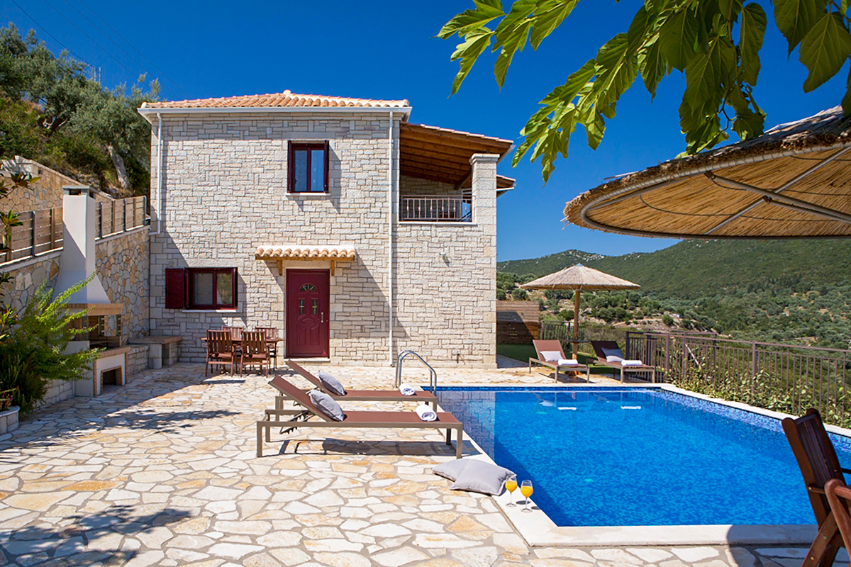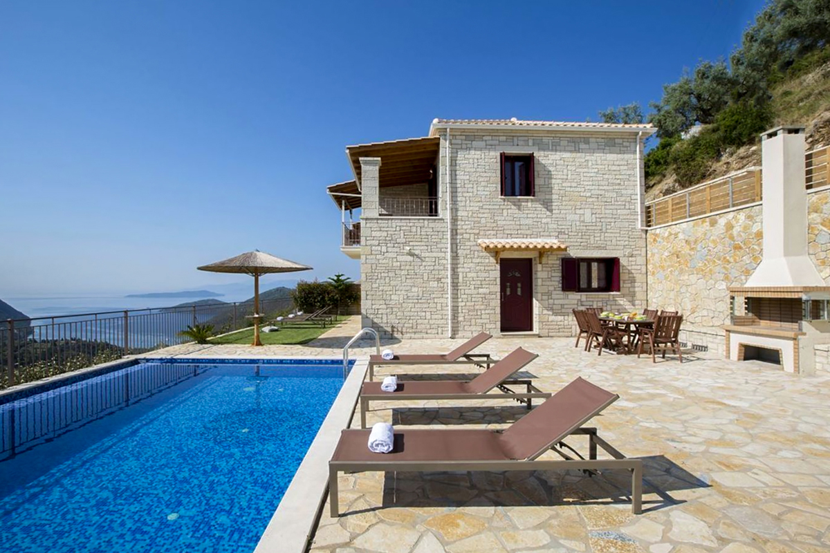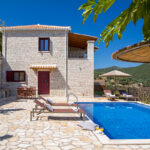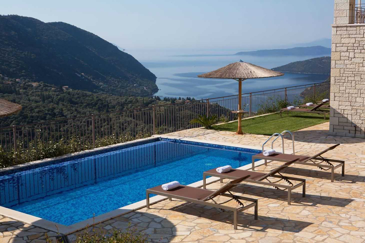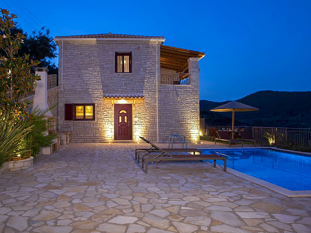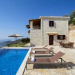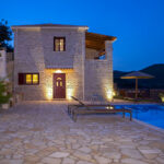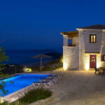 Luxury traditional stone villas with pool and sea views on Lekada Island.