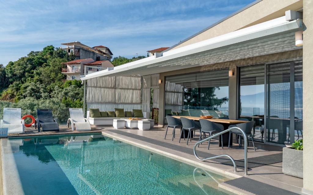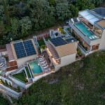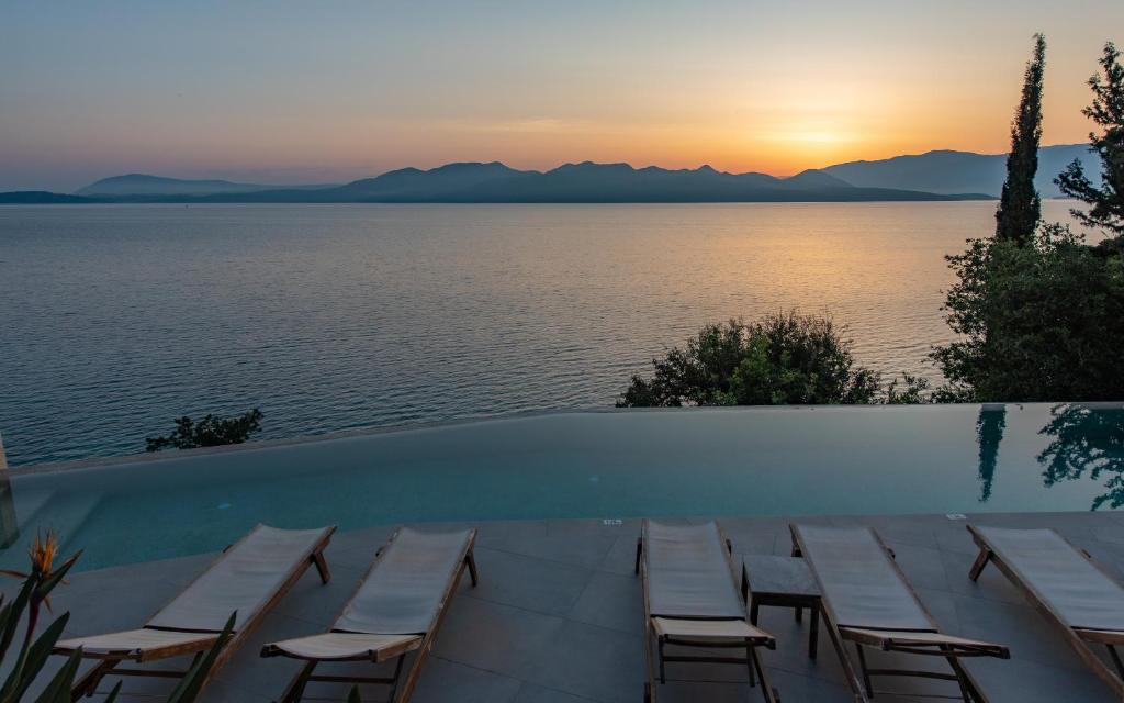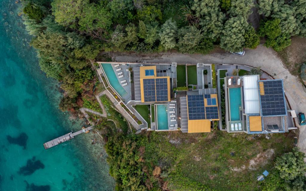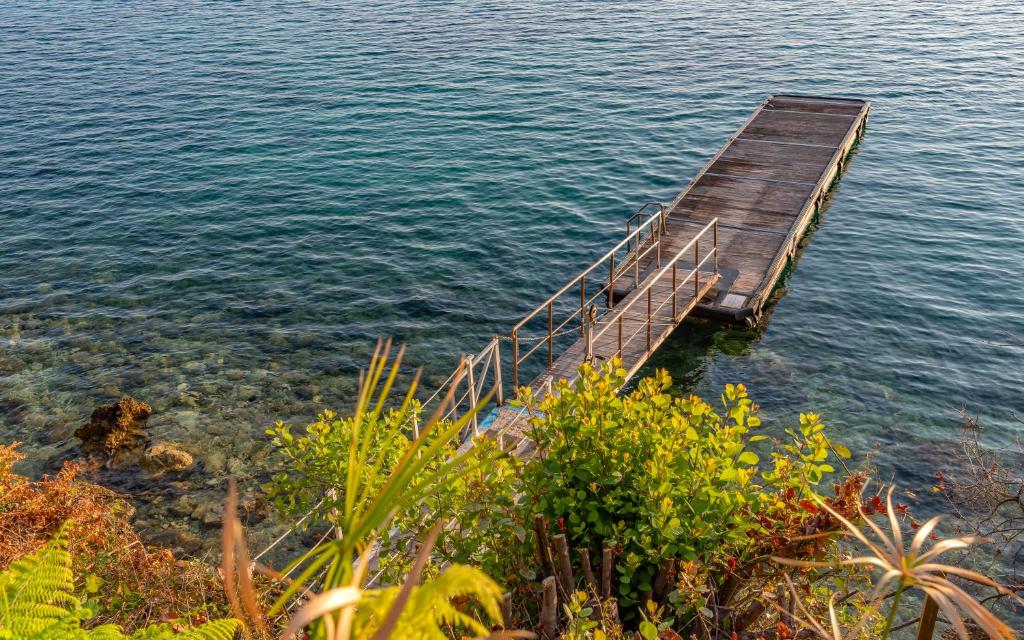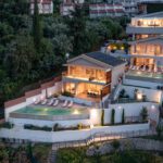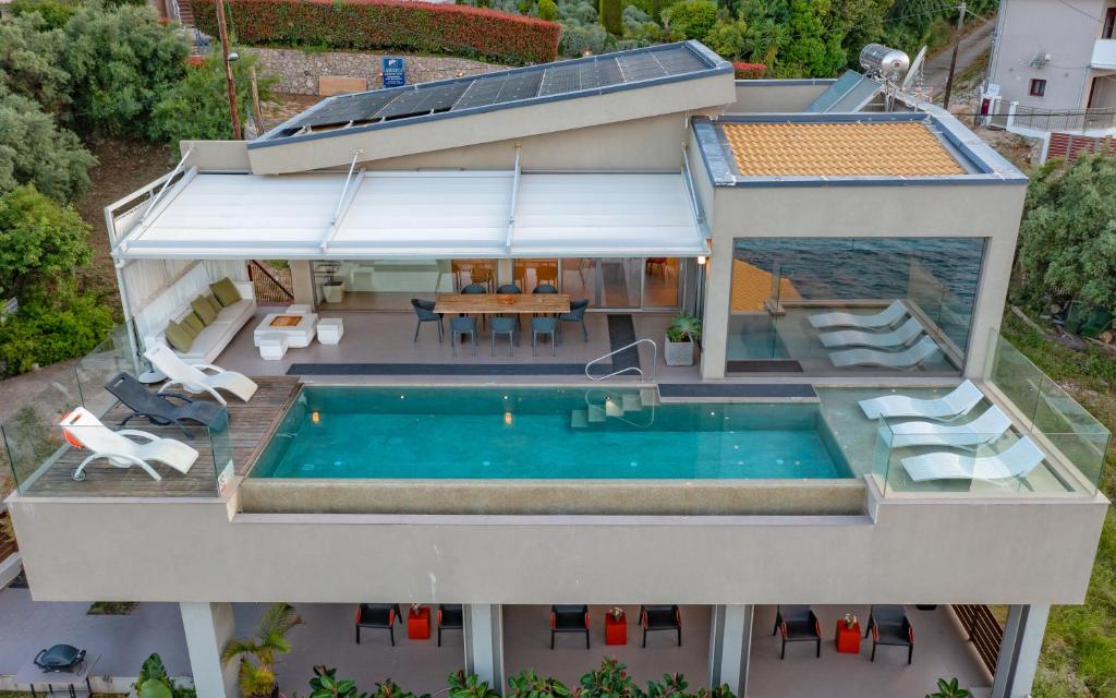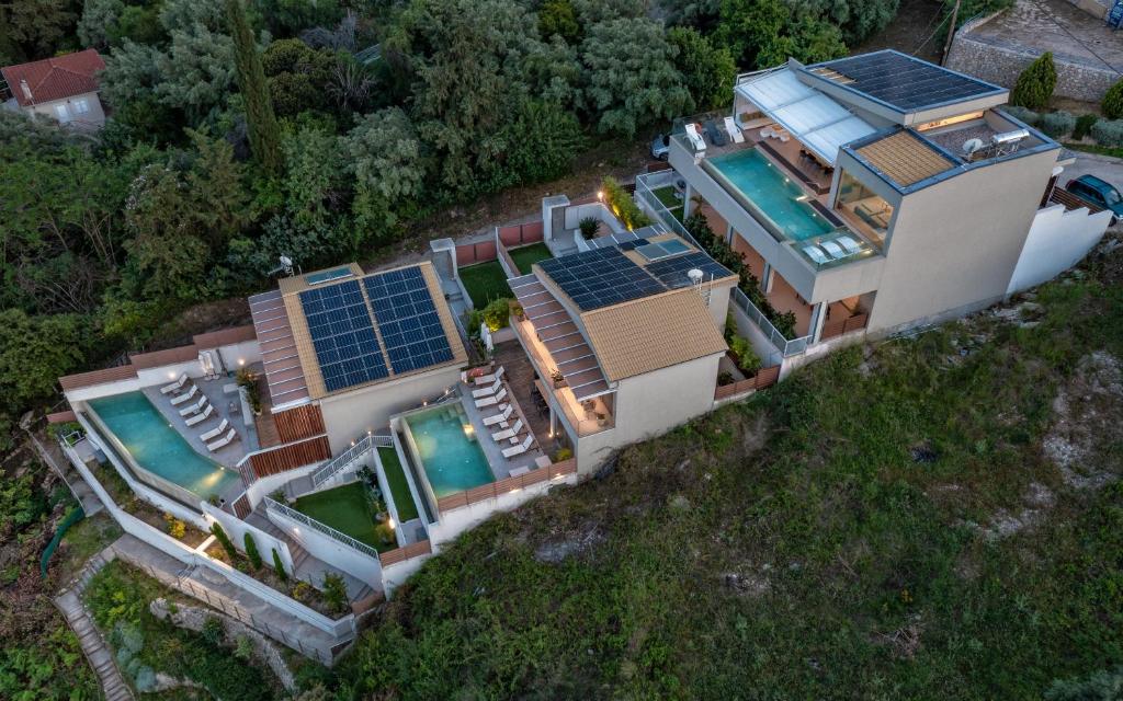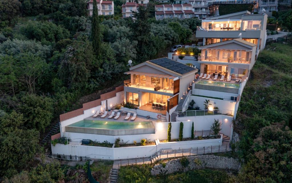 מתחם של 3 וילות חדשות יוקרתיות עם נוף פנורמי לים, ממוקמות באזור ניקיאנה Nikiana עם גישה לחוף הים דרך כמה מדרגות ומזח פרטי.