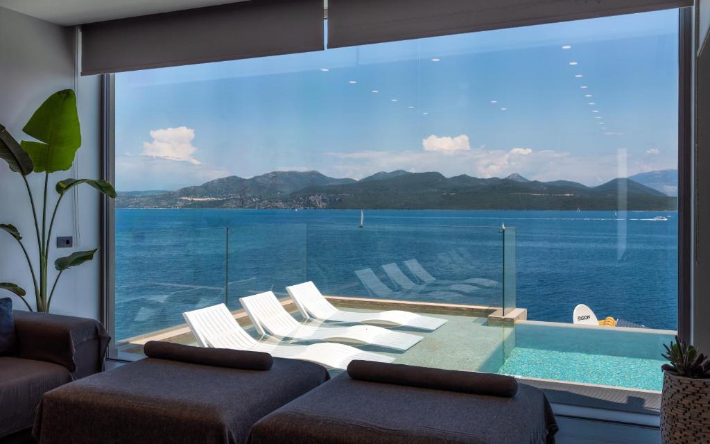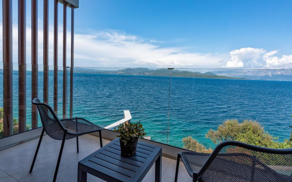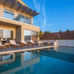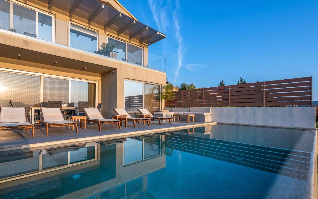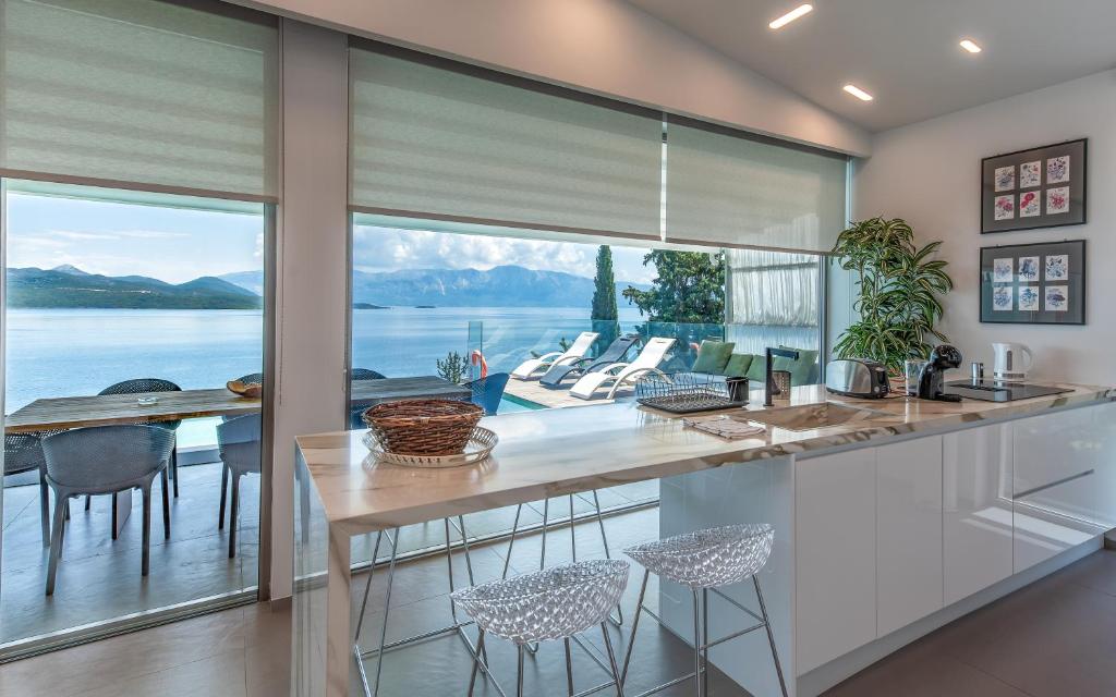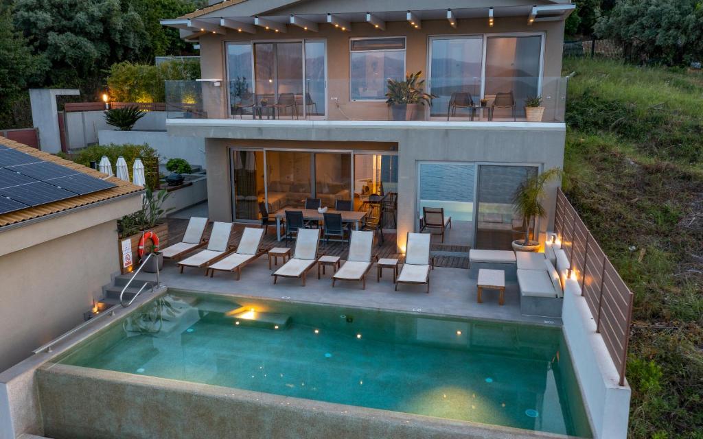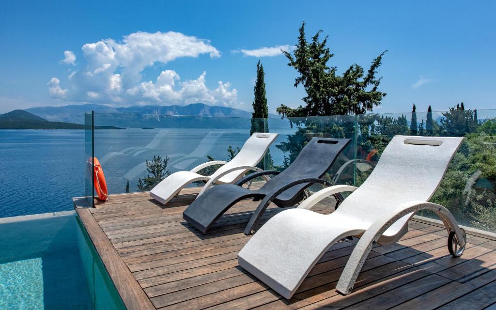 מתחם של 3 וילות חדשות יוקרתיות עם נוף פנורמי לים, ממוקמות באזור ניקיאנה Nikiana עם גישה לחוף הים דרך כמה מדרגות ומזח פרטי.
