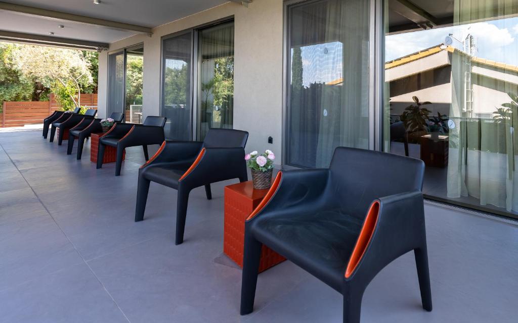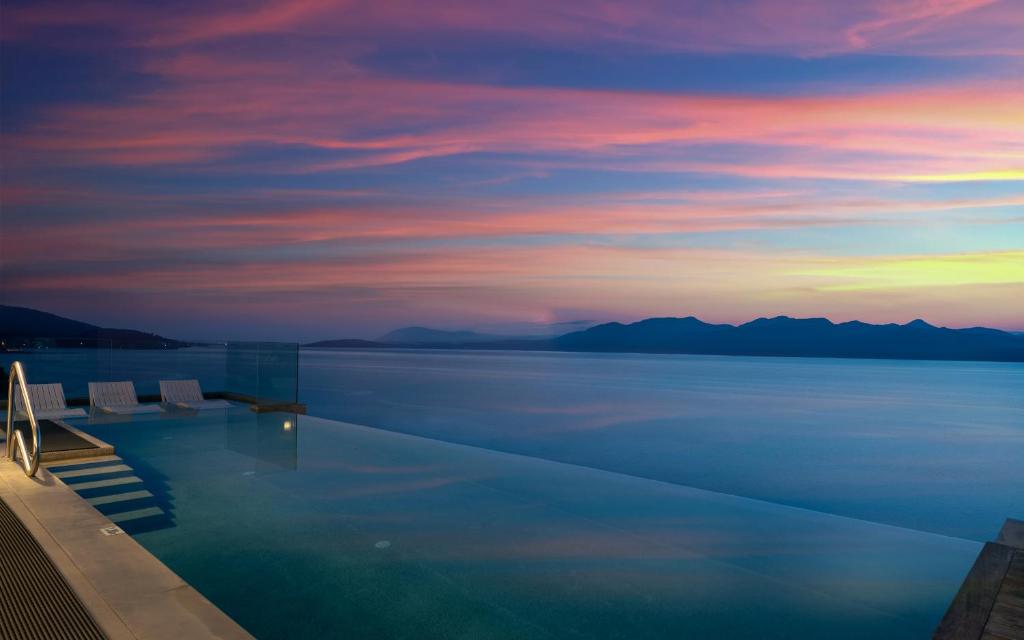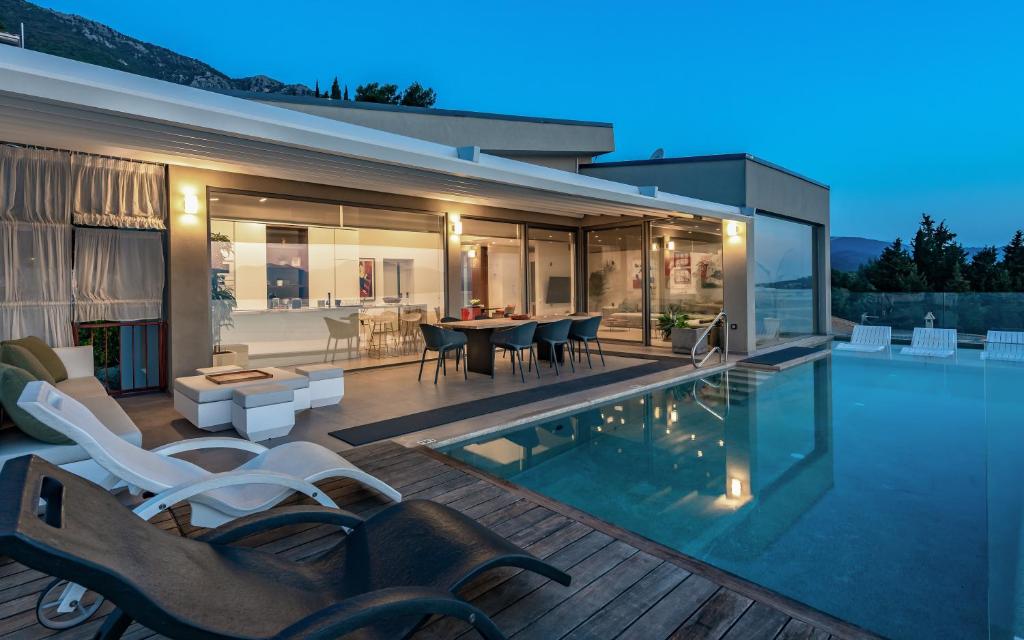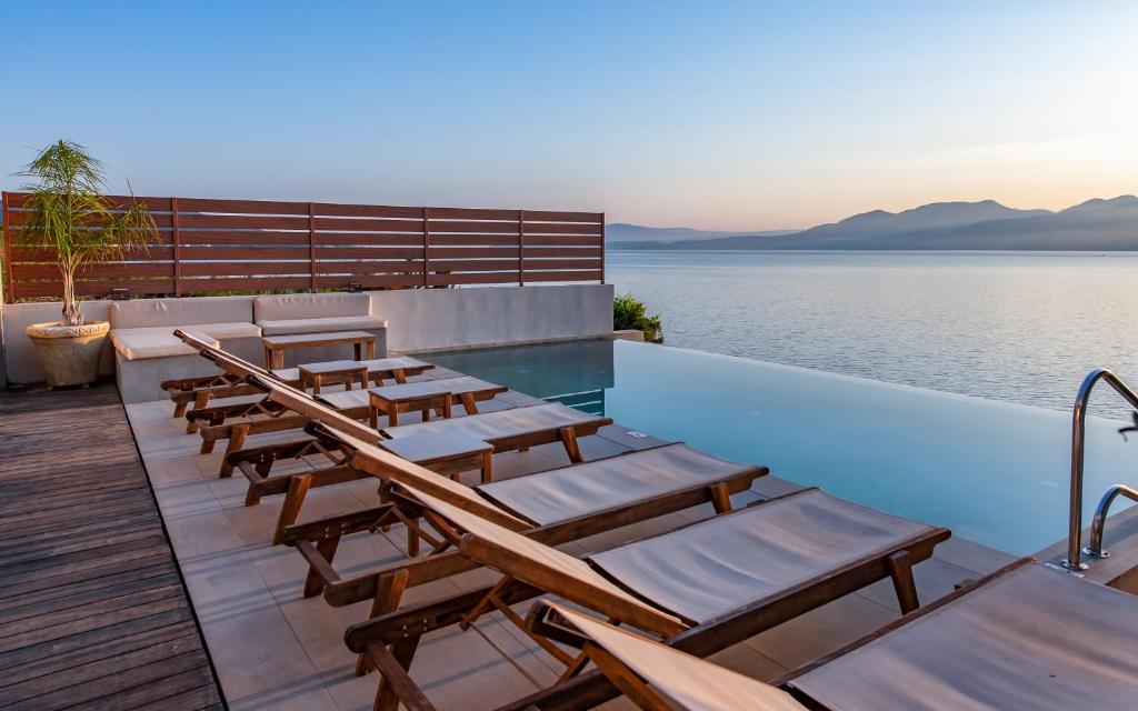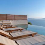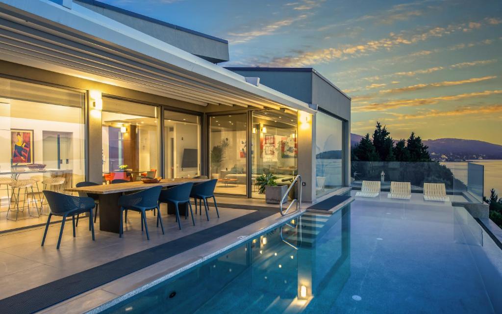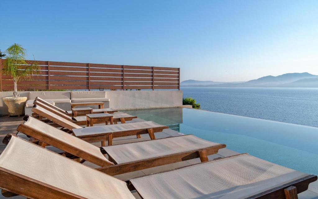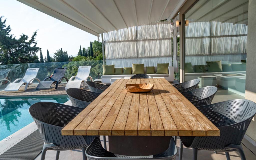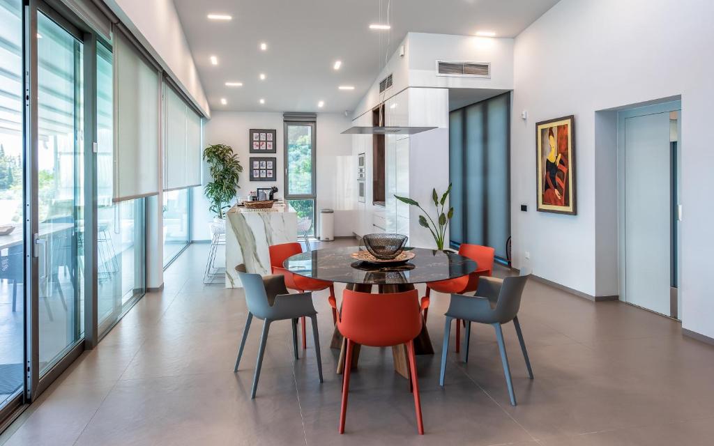 בריכת אינסוף , שולחן אוכל חיצוני, כיסאות מנגל, מרפסת עם מיטות שיזוף , חניה.