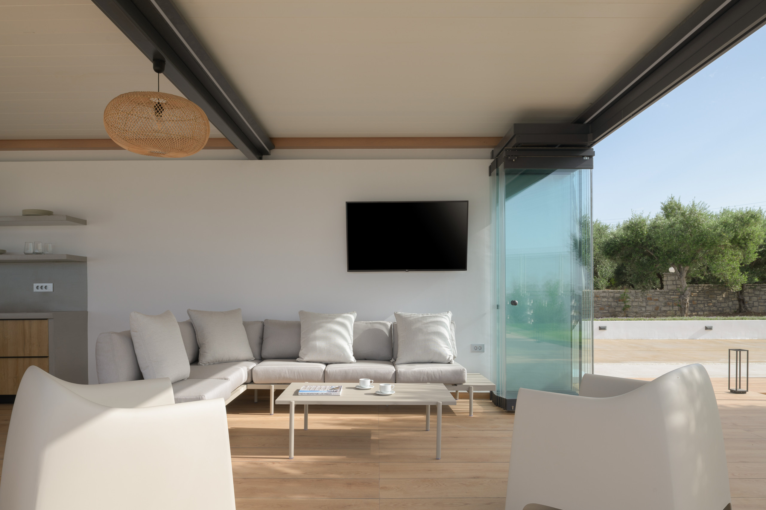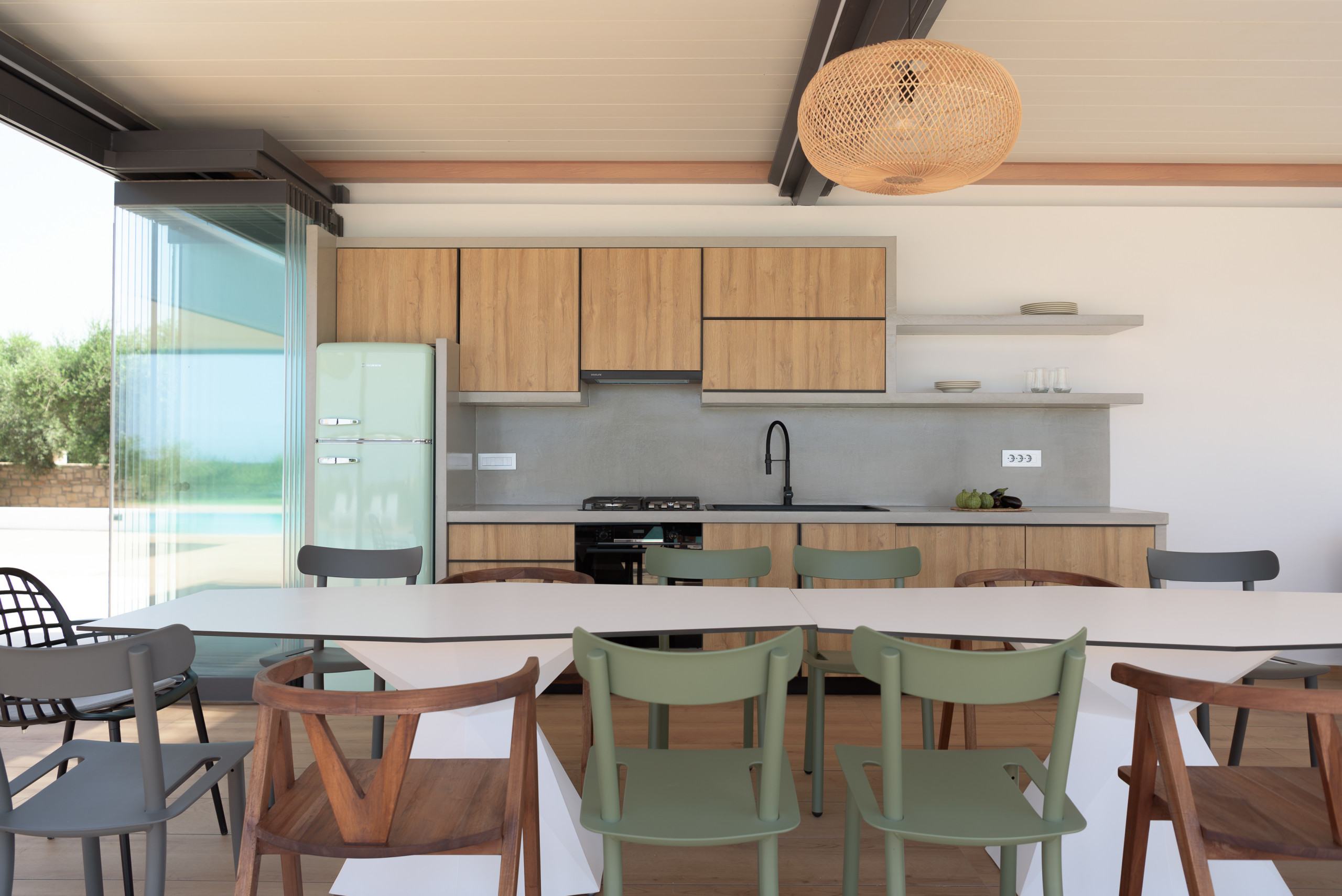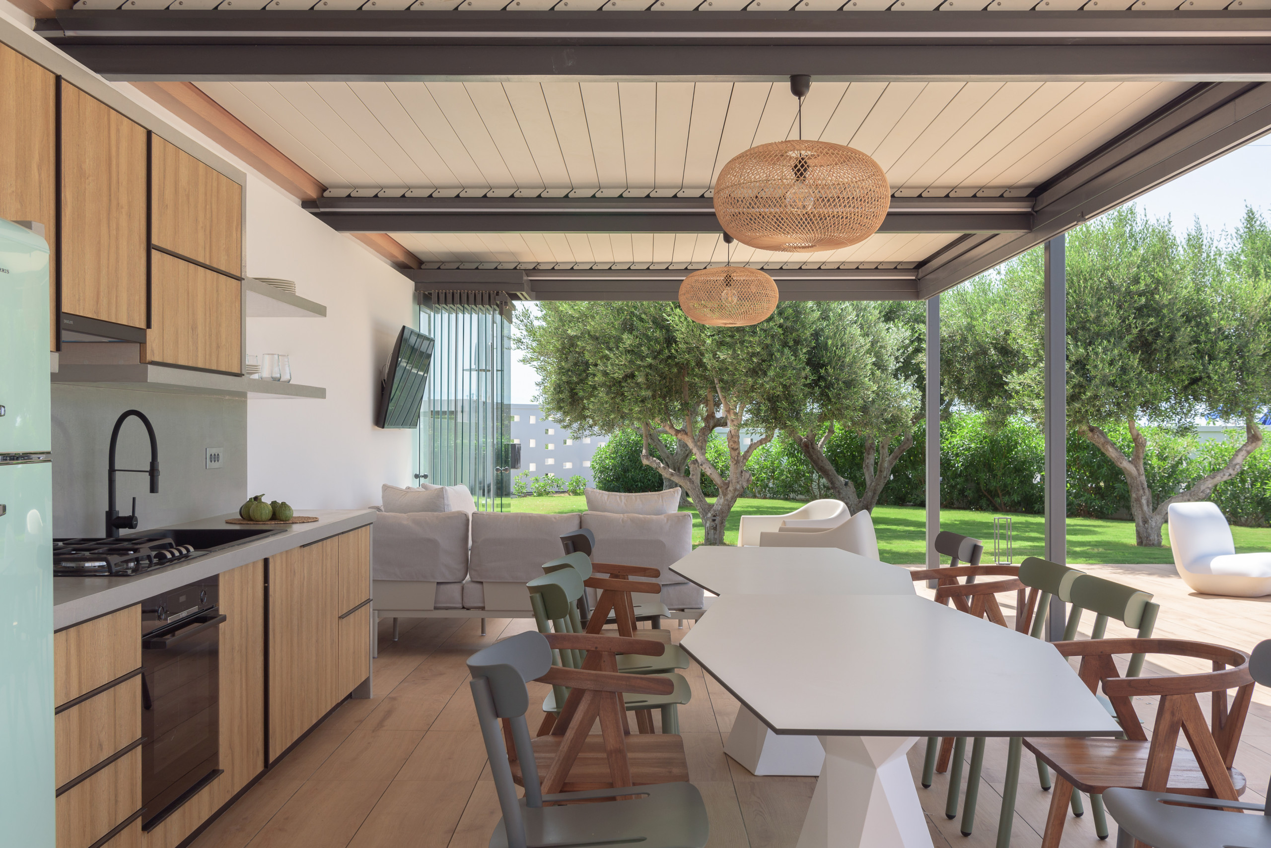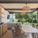 - אזור האוכל החיצוני מוצל עם פרגולה כולל:. ברביקיו גז , מטבח חיצוני המאובזר בכל הציוד החיוני , תנור חשמלי וכיריים גז, כיור, מקרר, מדיח כלים, סכו"ם, כלים וכוסות.