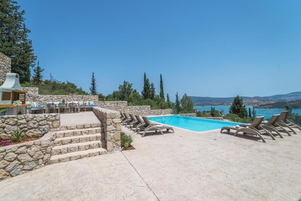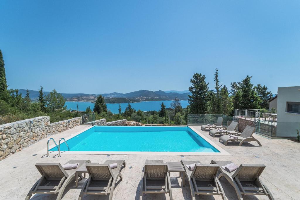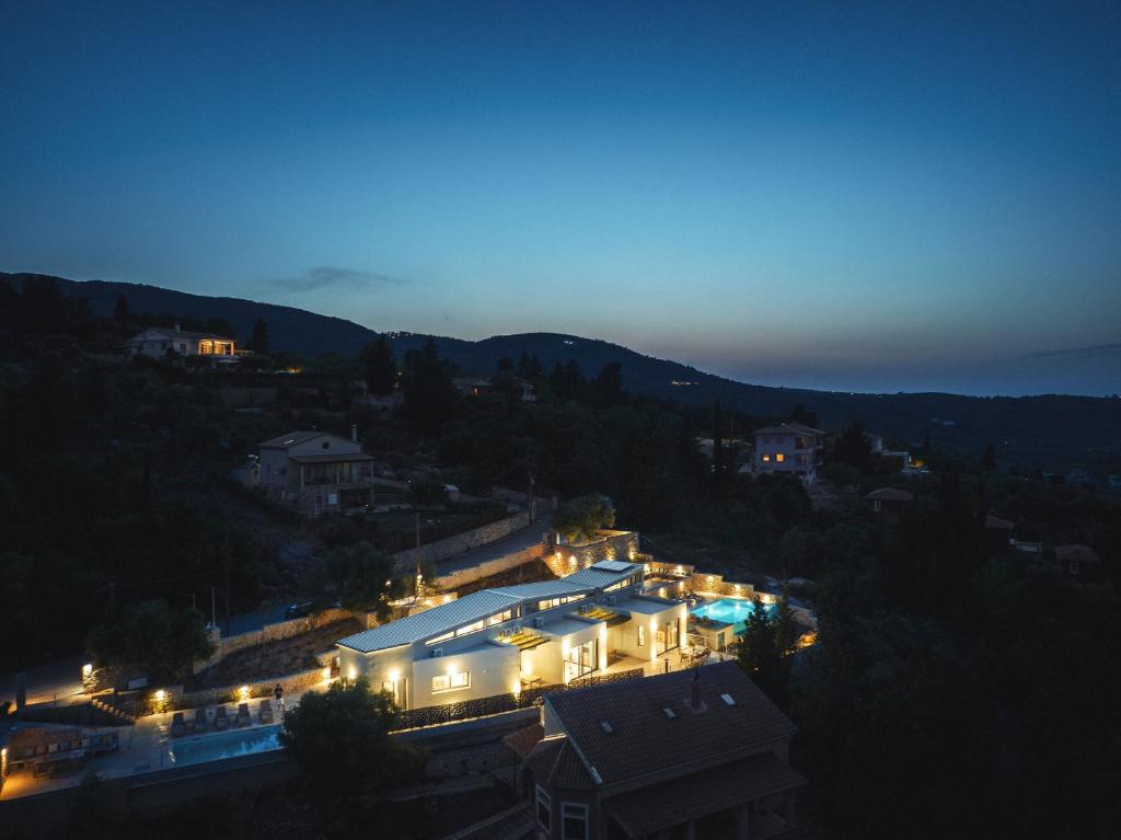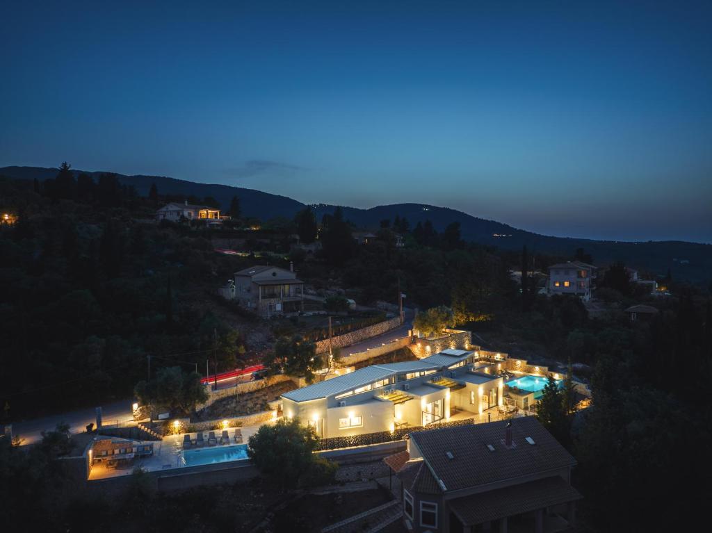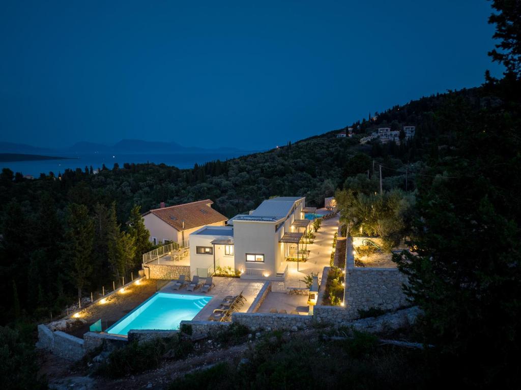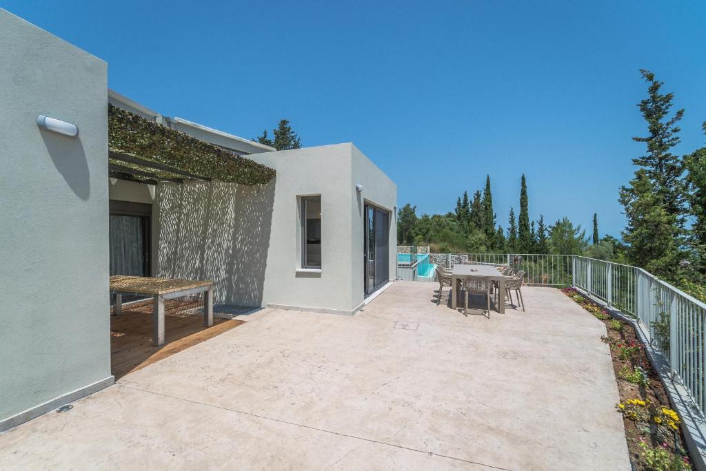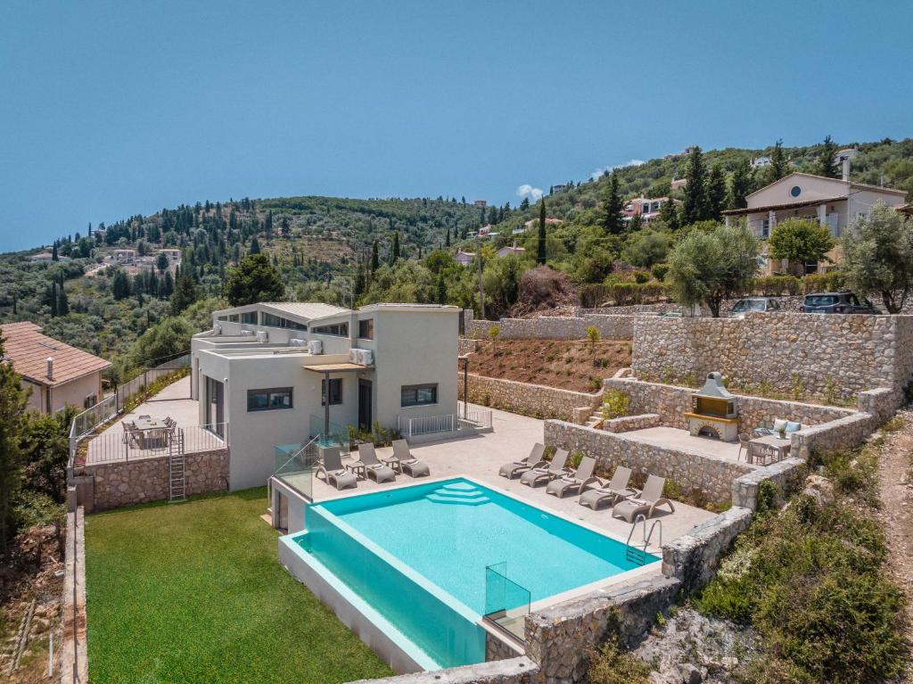 2 וילות חדשות ומודרניות שוכנות על צלע גבעה באזור ליגיה Lygia עם הנוף משקיף על גבעות ירוקות והכחול העמוק של הים היוני Ionian Sea.
