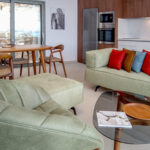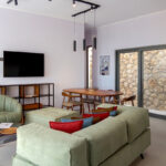 עם הכניסה לווילה, נכנסים לחלל המגורים הגדול שמתמלא באור שמש טבעי דרך דלתות לוח הזכוכית. בקצה האחד מטבח מאובזר עם פינת אוכל וסלון מרווחים.