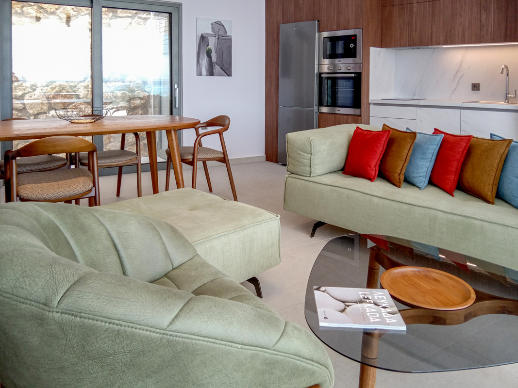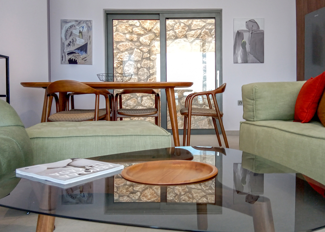 עם הכניסה לווילה, נכנסים לחלל המגורים הגדול שמתמלא באור שמש טבעי דרך דלתות לוח הזכוכית. בקצה האחד מטבח מאובזר עם פינת אוכל וסלון מרווחים.