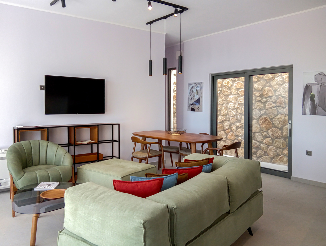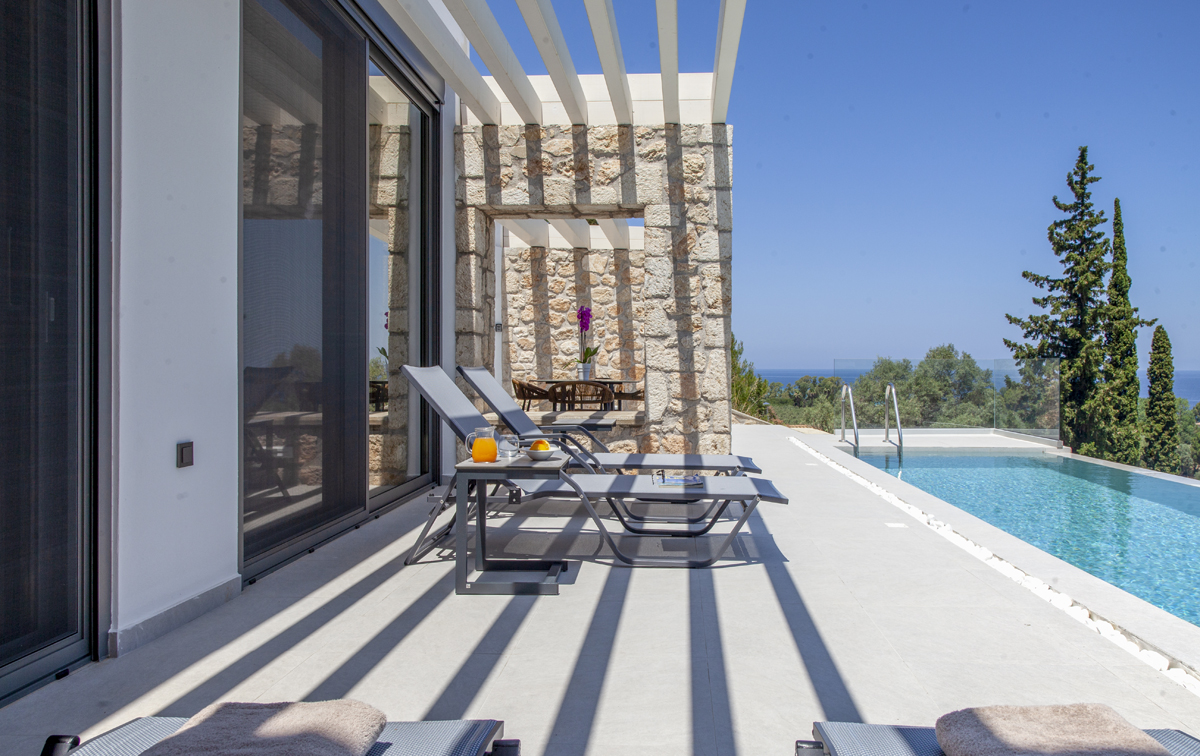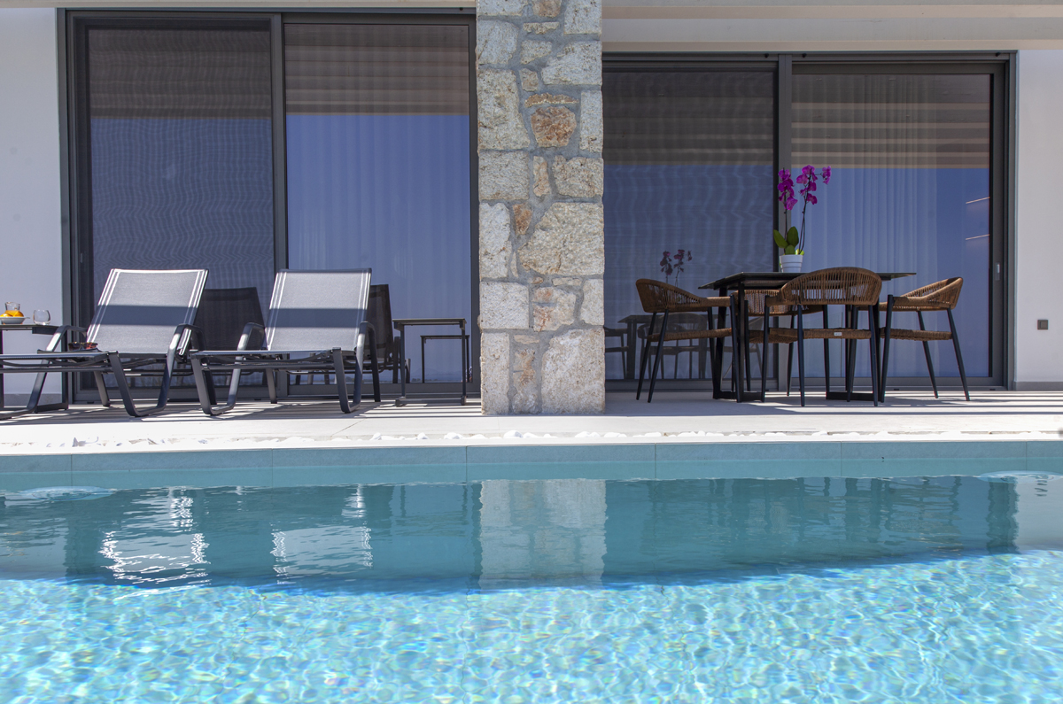 האזור חיצוני של הוילות מכבד את הארכיטקטורה היוונית וחומרים המשלבים אלמנטים מאבן ועץ תוך התחשבות באיכות ונוחות.