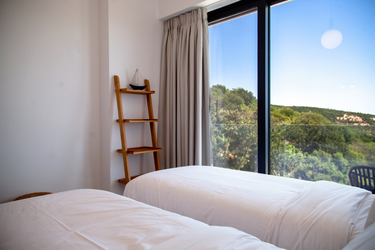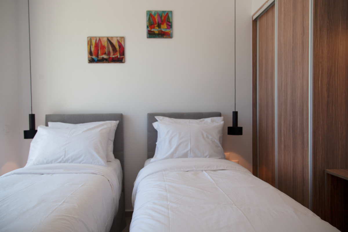 קומה עליונה: חדר שינה עם מיטה זוגית ו עוד 2 חדרי שינה עם מיטות טווין הניתנות להפרדה. כל אחד מחדרי השינה עם יציאה למרפסת.