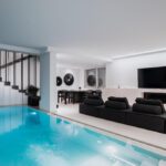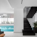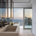 מפלס אחד למטה: בריכת השחייה היא חלק מאזור מגורים אחר ונוף אינסופי לים. דלתות הזכוכית הגדולות מהרצפה עד התקרה נפתחות אל הפטיו שבו מיטות יום גדולות יושבות בצל ומשלבות בצורה חלקה מגורים פנימיים וחיצונים. בפטיו, מקלחת חיצונית, חדר רחצה ומטבח מאובזר (ראשי) ופינת האוכל המהודרת.