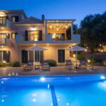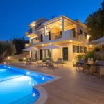 A beautiful villa with a large private swimming pool and a spacious garden around it.