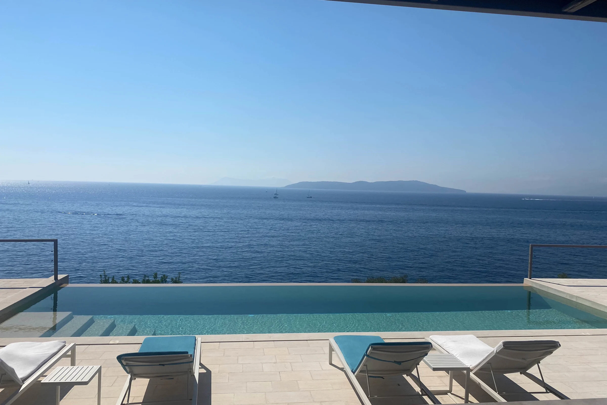 • בריכת האינסוף משקיפה על האופק עם נוף מדהים על איי איתקה וקפלוניה, .