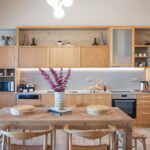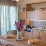 בחלל זה מטבח מאובזר, פינת אוכל ואזור סלון הפונה לים היוני.
