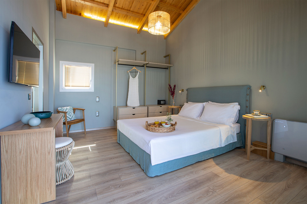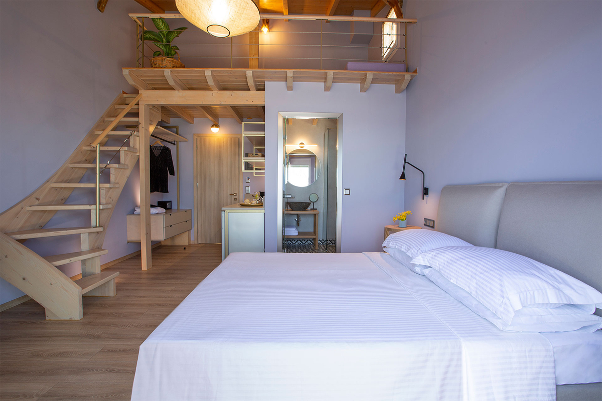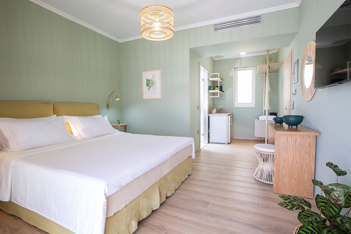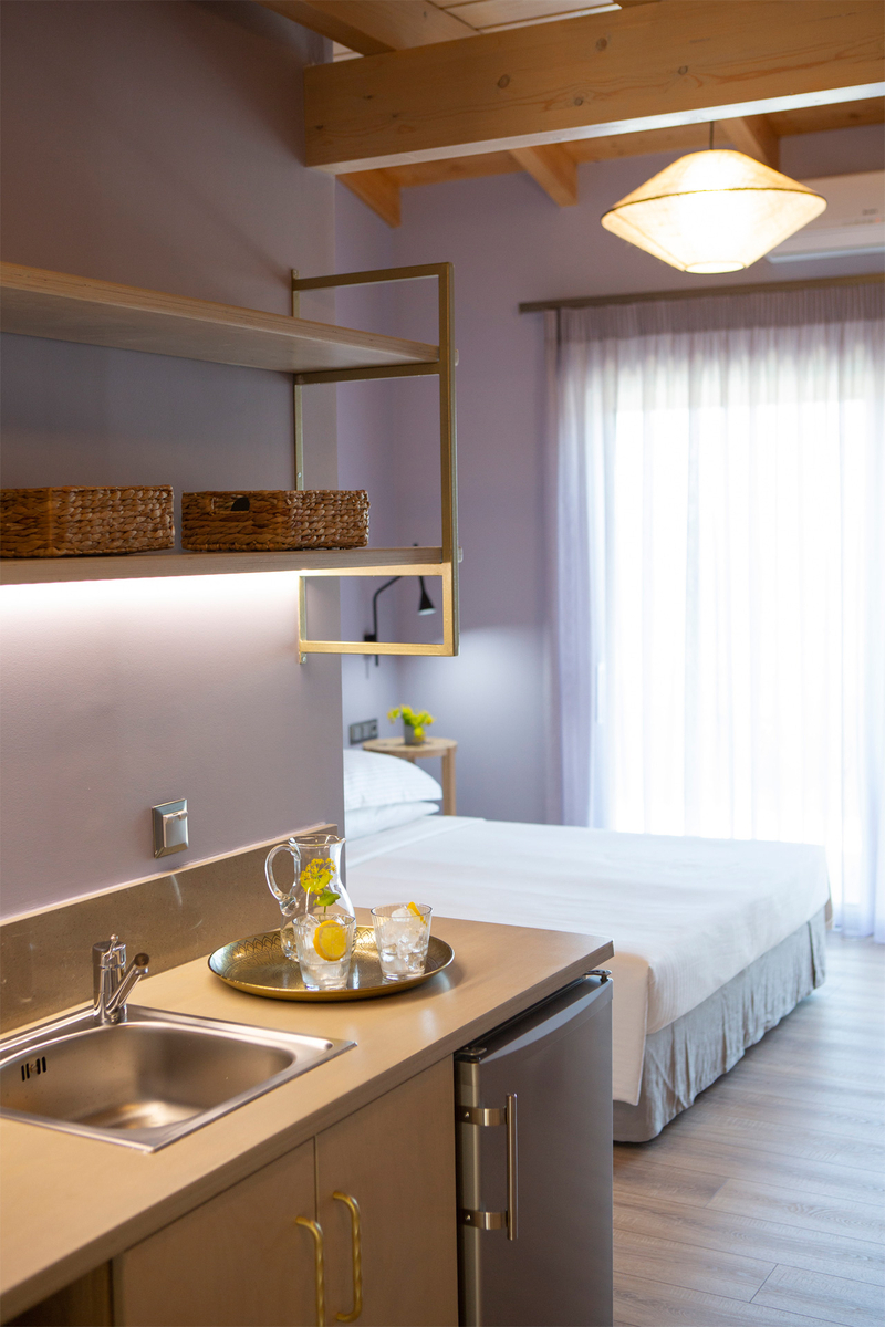 • חדר זוגי עם מטבחון ובו מקרר קטן ומכונת אספרסו, חדר מקלחת ושירותים צמודים ויציאה למרפסת פרטית עם פינת ישיבה.