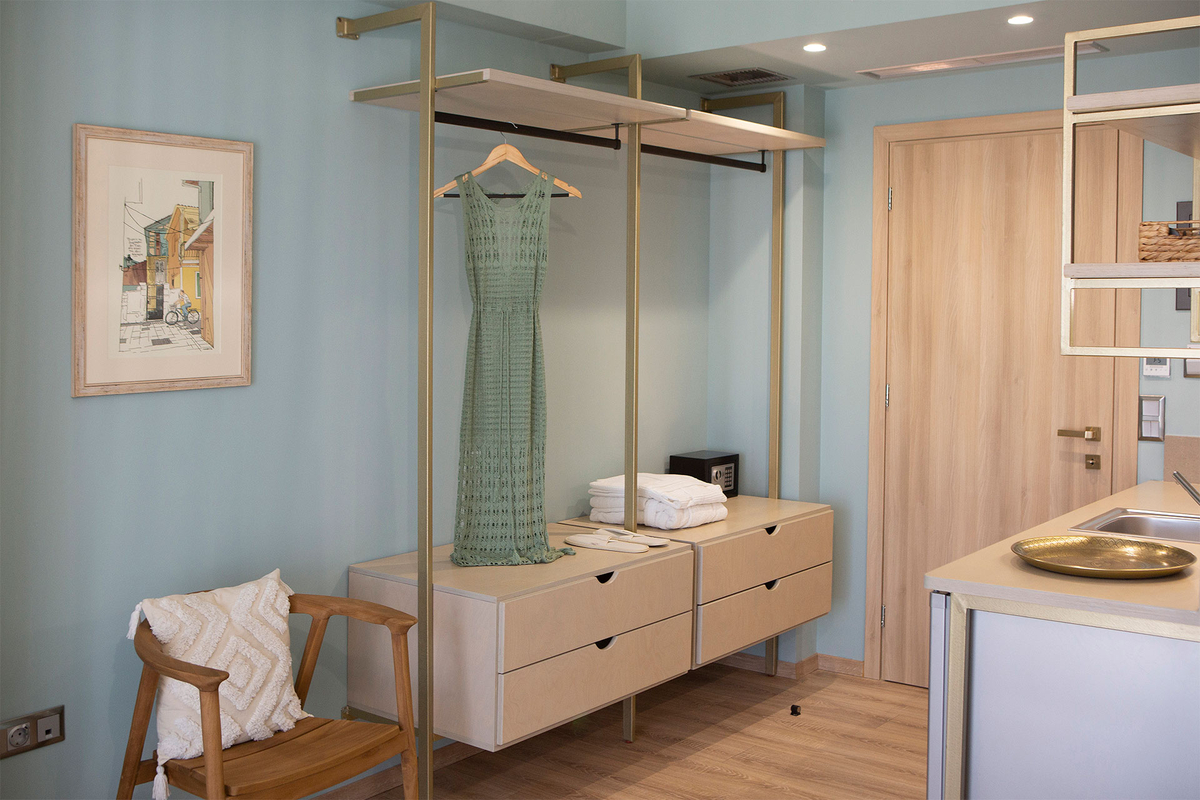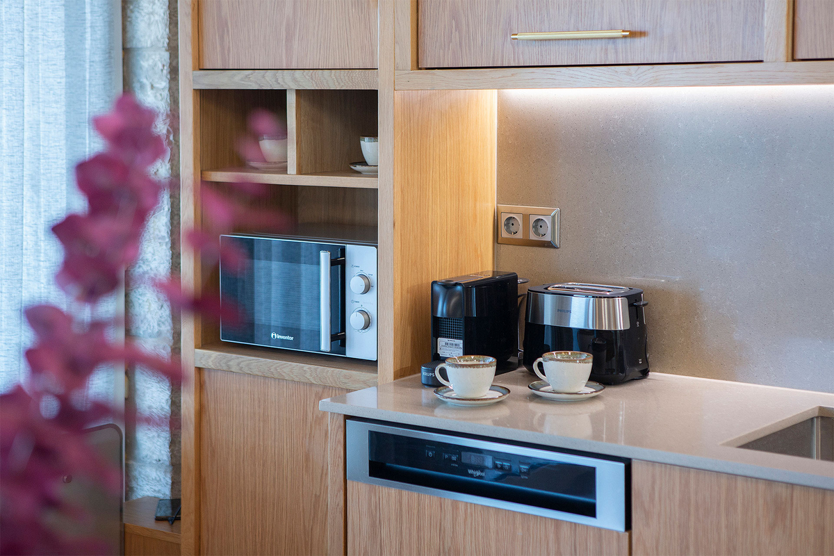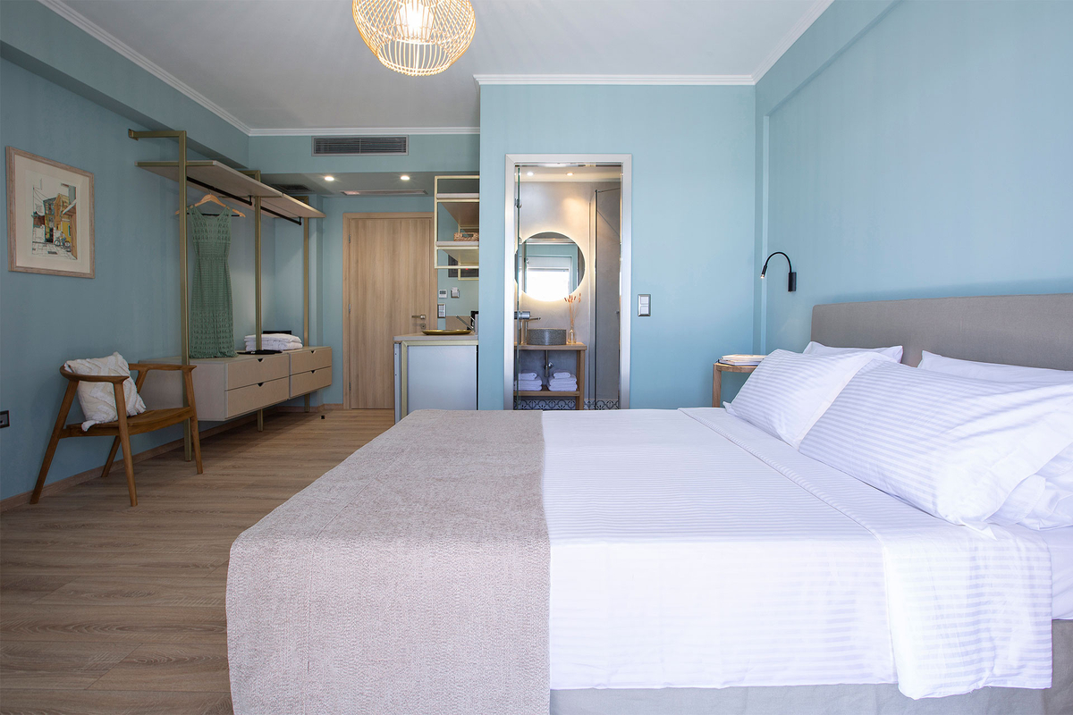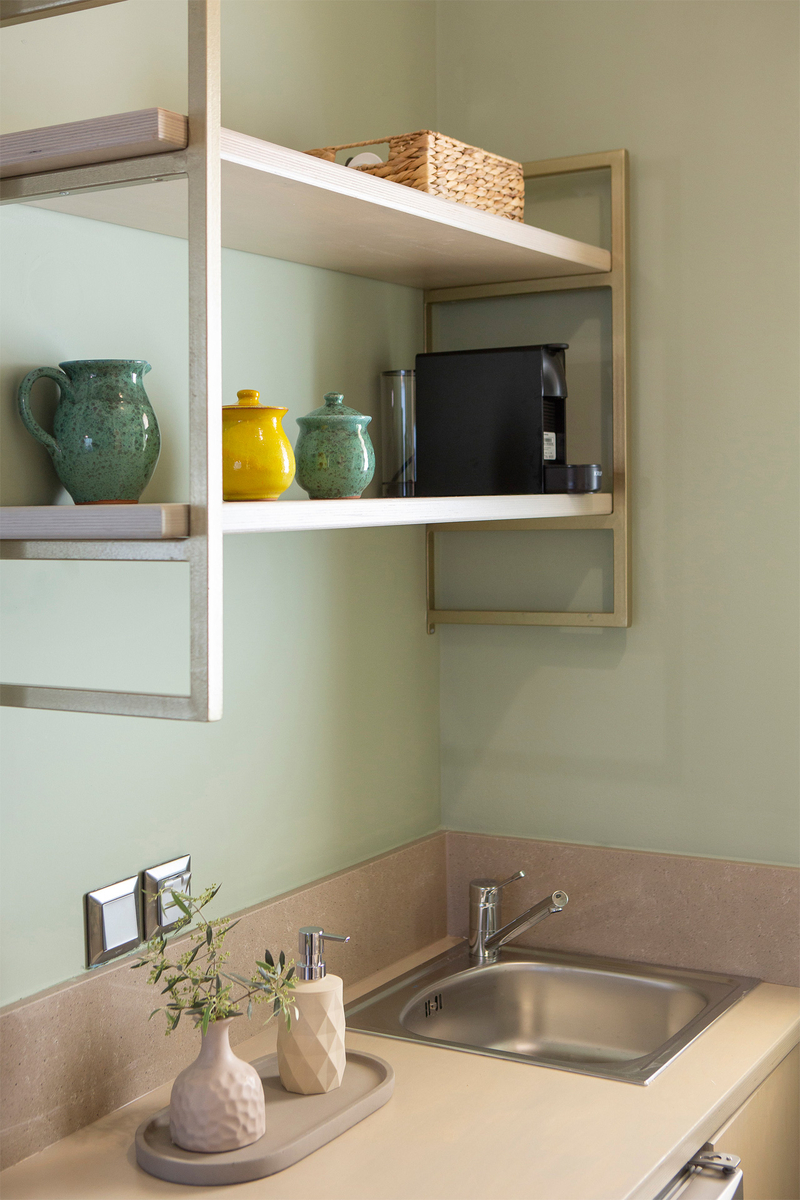 • חדר זוגי עם מטבחון ובו מקרר קטן ומכונת אספרסו, חדר מקלחת ושירותים צמודים ויציאה למרפסת פרטית עם פינת ישיבה.