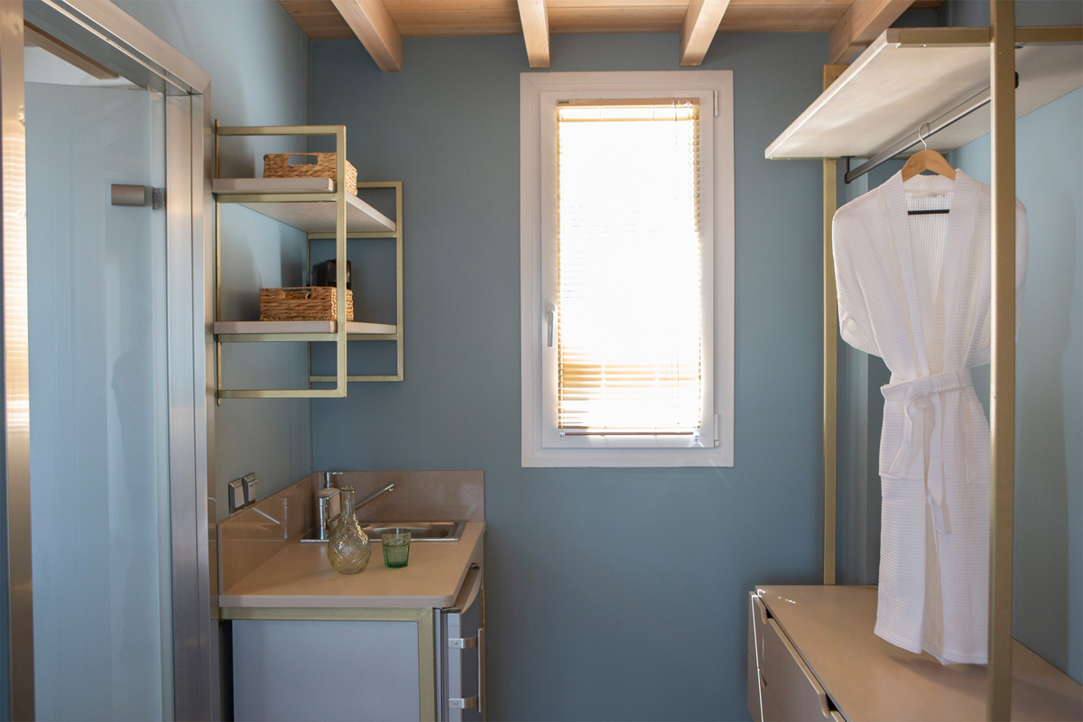 • חדר טווין עם מטבחון ובו מקרר קטן ומכונת אספרסו, חדר מקלחת ושירותים צמודים ויציאה למרפסת פרטית עם פינת ישיבה.