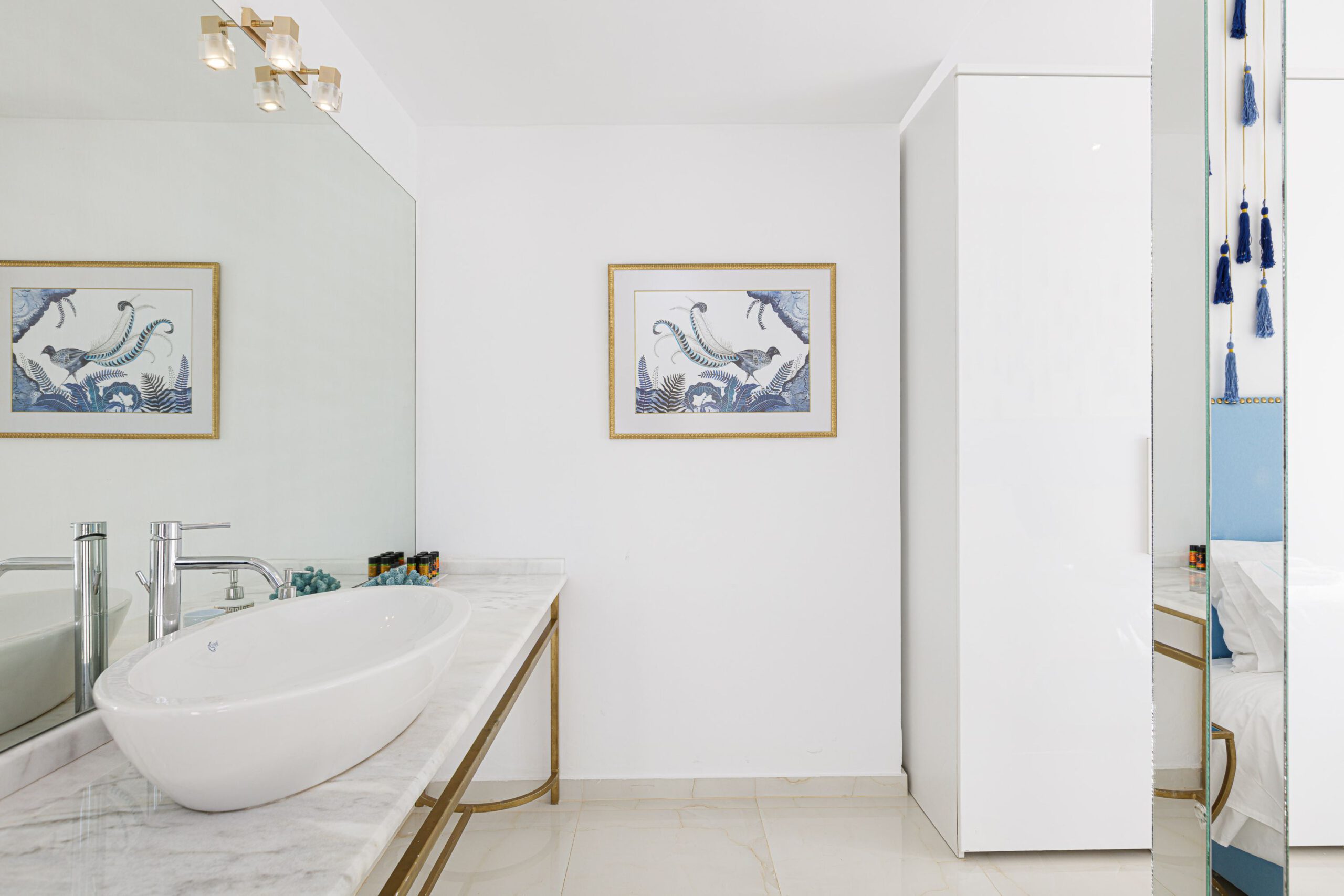 במורד  המדרגות המובילות למפלס הקרקע של הבניין הראשי,יש מסדרון המעוטר באלגנטיות עם הדגשות זהב ויצירות אמנות המושפעות מהים. ישנם שני חדרי שינה ממוזגים  שניהם כוללים מיטת קינג סייז (1,80 X 2,00 ס"מ) עם גישה ישירה לגן עם נוף לים של חוף לוטראקי. שני חדרי השינה כוללים חדרי רחצה צמודים עם מקלחות הידרומסאז', ארונות וטלוויזיות בגודל 32 אינץ'. לבסוף יש חדר כביסה במפלס הזה.