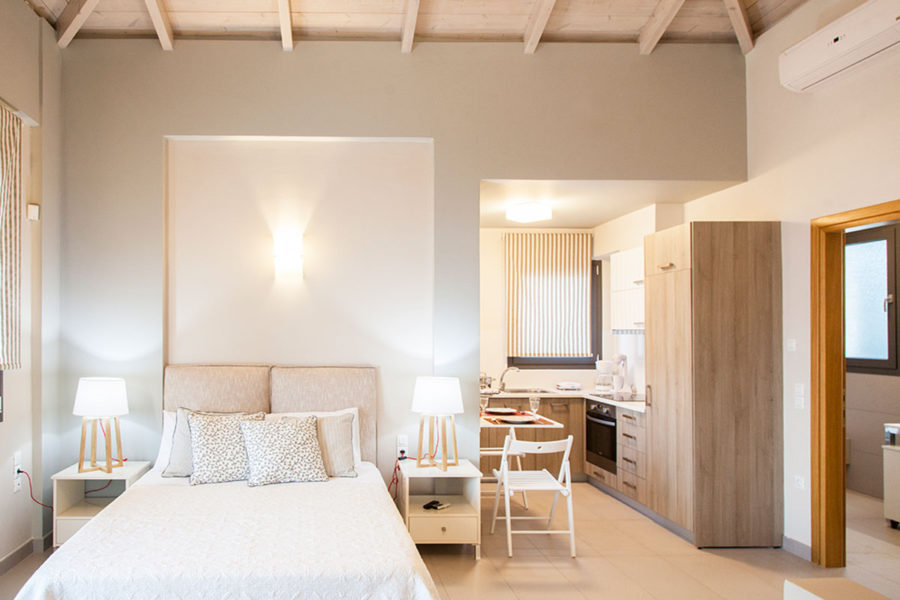 קומת קרקע: חלל אזור מגורים פתוח עם פינת אוכל, מטבח מאובזר ויציאה לבריכה. חדר שינה זוגי ואפשרות לינה של אדם אחד על הספה בסלון.