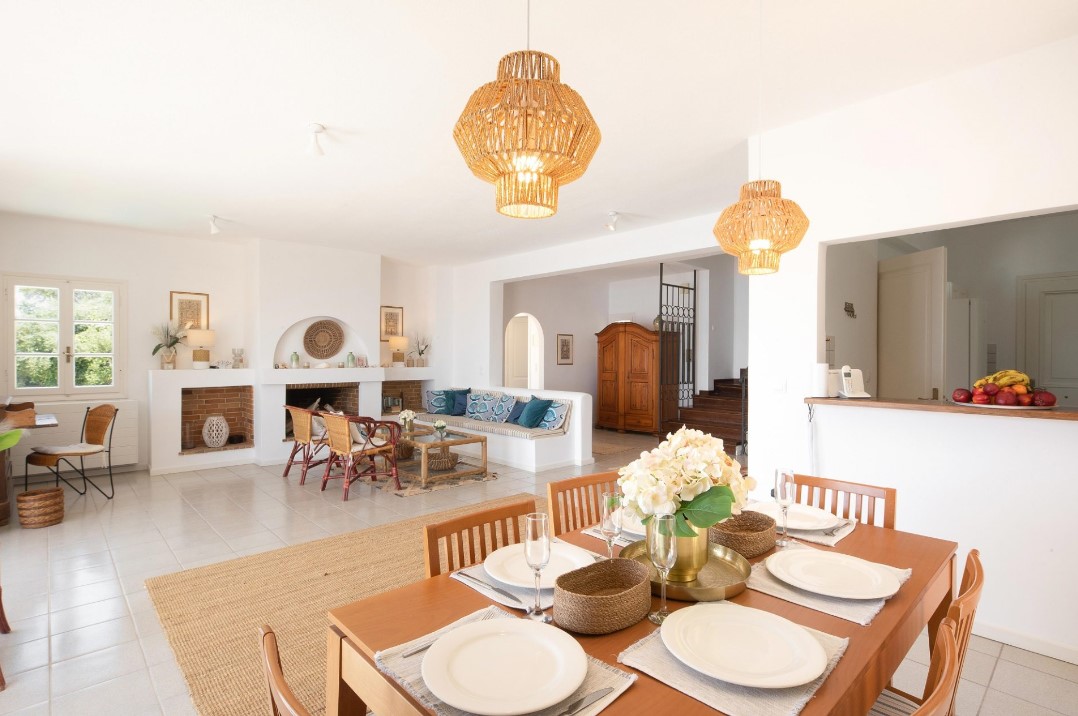 סלון גדול בחלל פתוח עם מקומות ישיבה בסגנון מיקונוס, שולחן אוכל, שולחן כתיבה ואח.