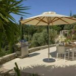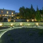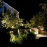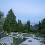 מרפסות מרוצפות אבן מנוקדות בערוגות של צמחים ושיחים ארומטיים.