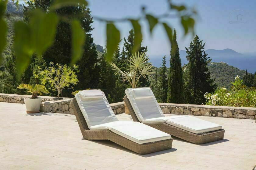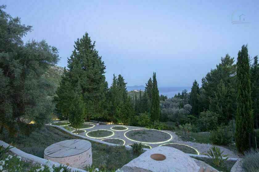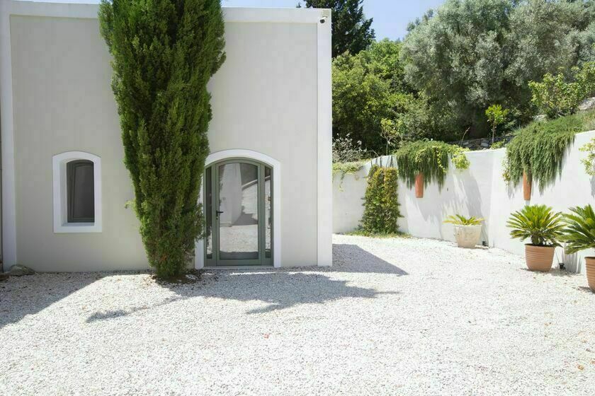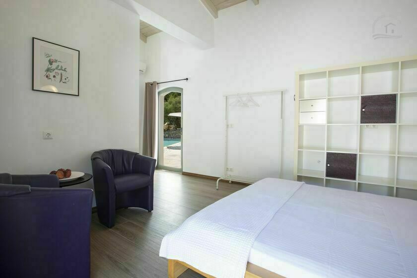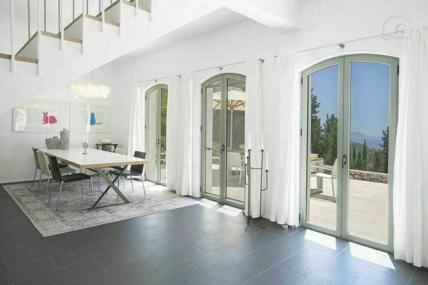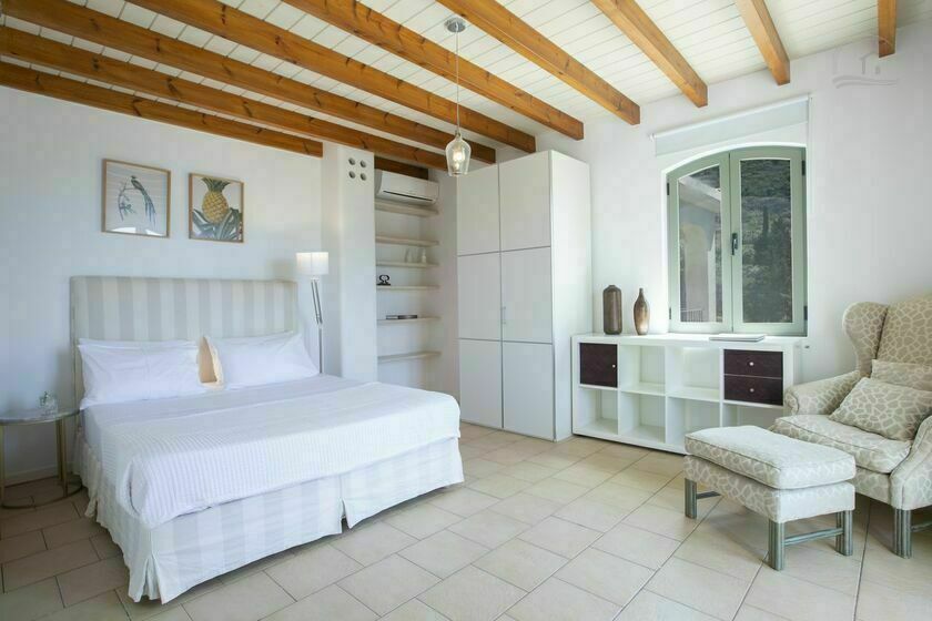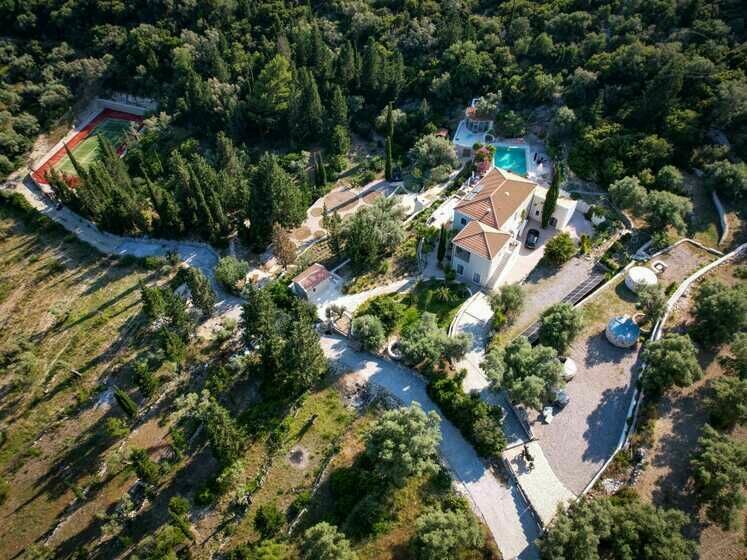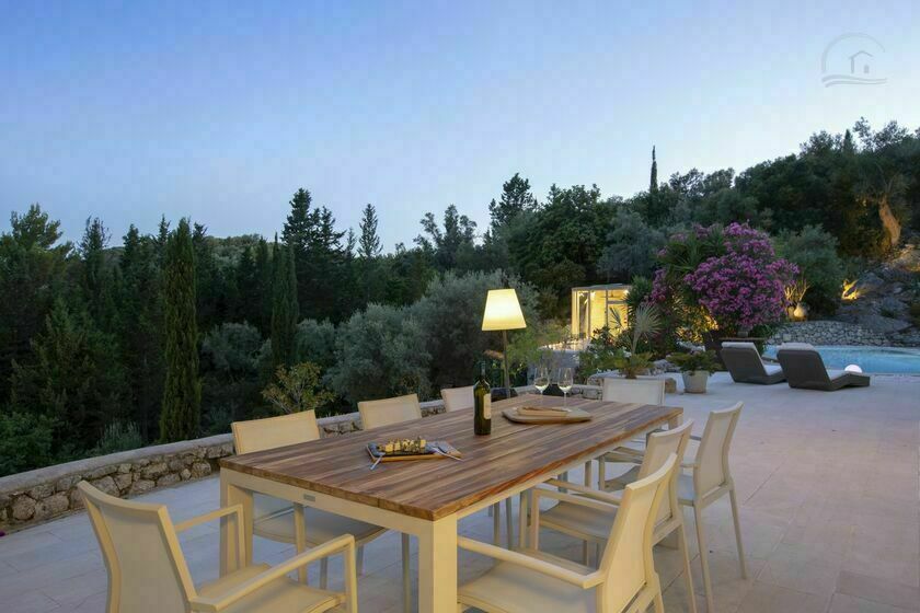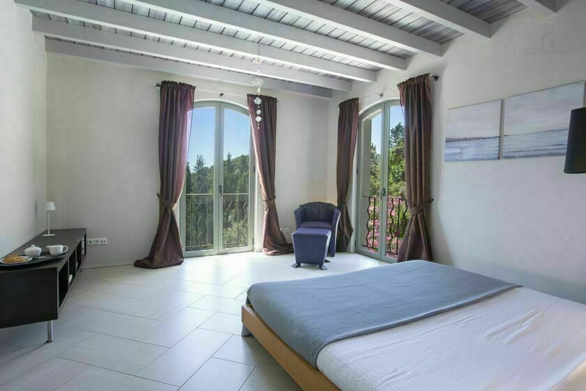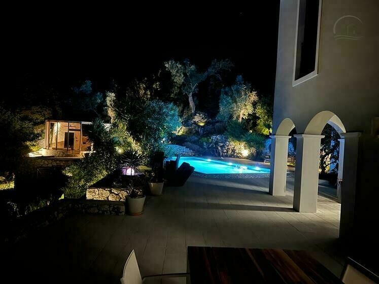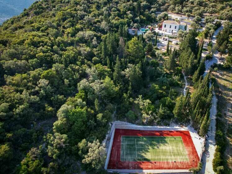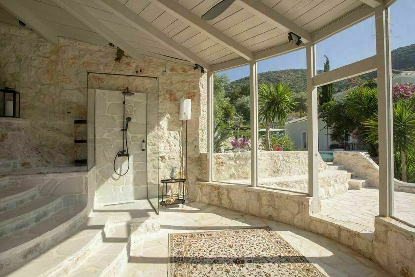 הווילה בשטח של 286 מ"ר, עם 4 חדרי שינה עם שני חדרי רחצה צמודים, חדר רחצה אחד משותף, שירותים אחד באזור הסלון ומקלחת אחת בתוך החמאם, ממוקמת בלב הטבע, ב-Poros, Lefkada