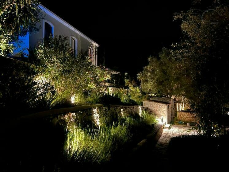 מרפסות מרוצפות אבן מנוקדות בערוגות של צמחים ושיחים ארומטיים.