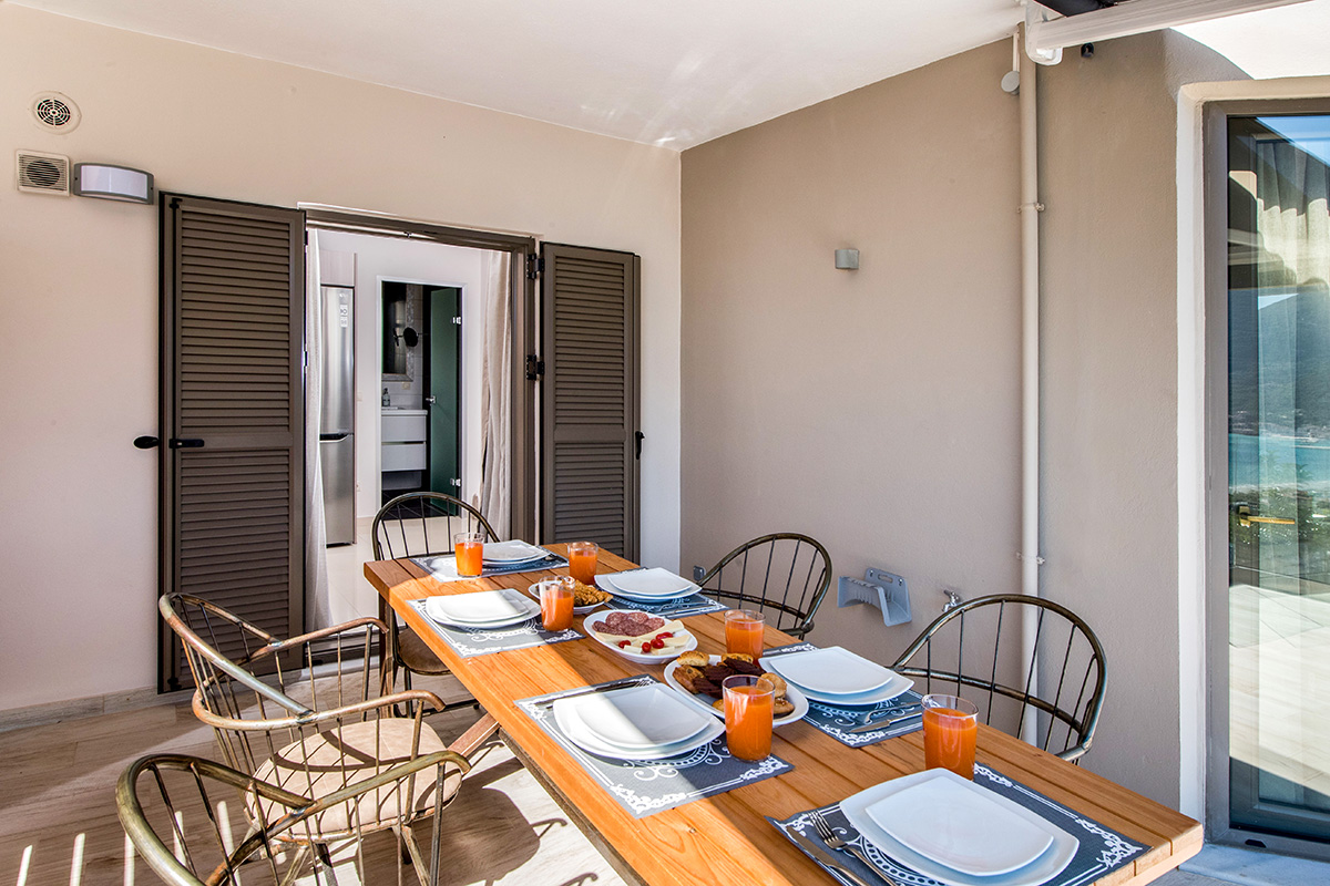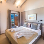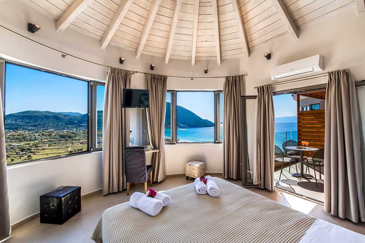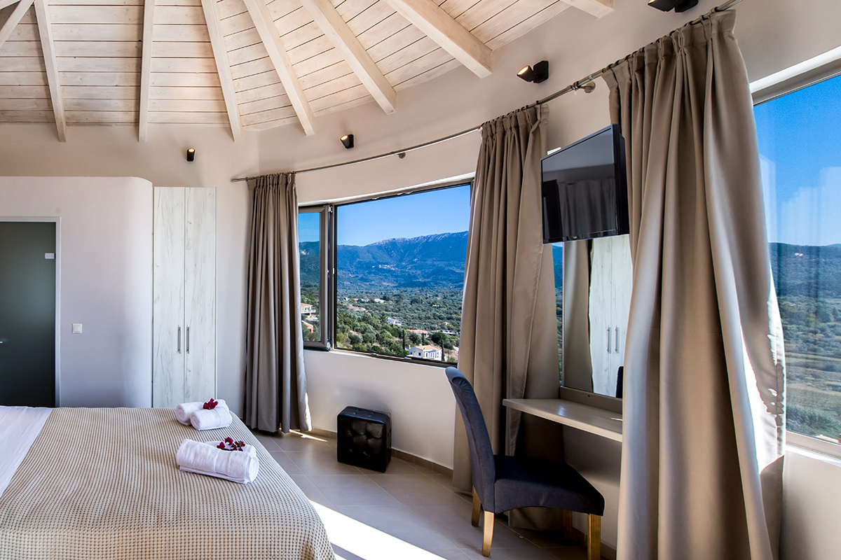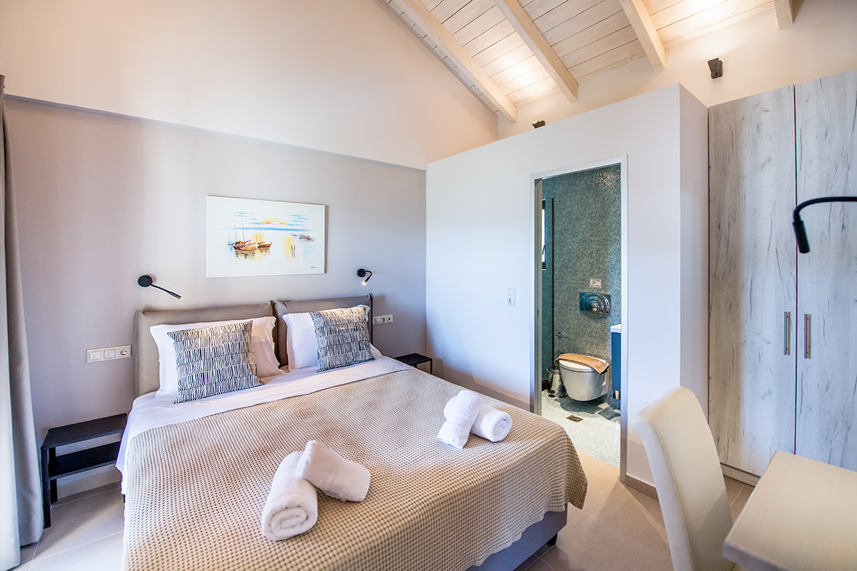 - שני חדרי שינה זוגיים עם חדר רחצה צמוד עם מקלחת. מאחד מחדרי השינה יש גישה ישירה למרפסת עם פינת ישיבה חיצונית עם נוף עוצר נשימה של הים היוני ומפרץ וסיליקי המשתרעת אל האי קפלוניה Kefalonia ואיתקה Ithaca .