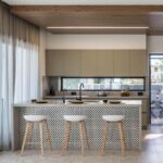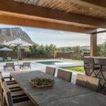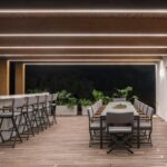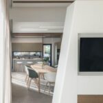 חלל מגורים מקורה מואר ונוח בעל מערכת קירות זכוכית עם גישה ישירה למרפסת בריכה. פינת אוכל ופינת טלוויזיה .