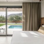 חדר שינה A-1 קומת קרקע: קומת קרקע: מיטה זוגית (160×200 אינץ'), גן זית ונוף לבריכה, חדר רחצה צמוד, טלוויזיה חכמה, NETFLIX, מזגן, שולחן עבודה, כספת, מרפסת עם ריהוט, גישה ישירה לבריכה