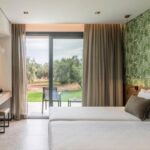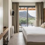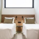 חדר שינה A-6 קומה ראשונה: 2 מיטות טווין (90×200 אינץ' + 90×200 אינץ'), חדר רחצה צמוד, טלוויזיה חכמה, NETFLIX, כספת, שולחן מיזוג אוויר, מרפסת עם ריהוט, נוף לגן הזיתים