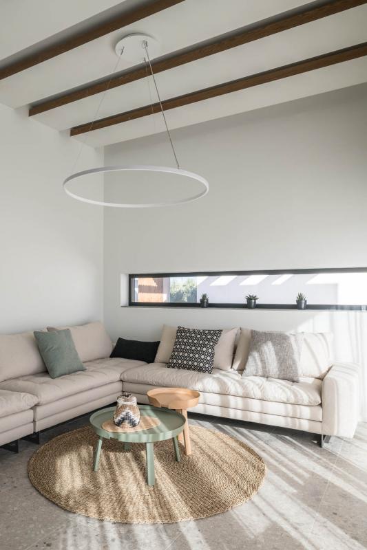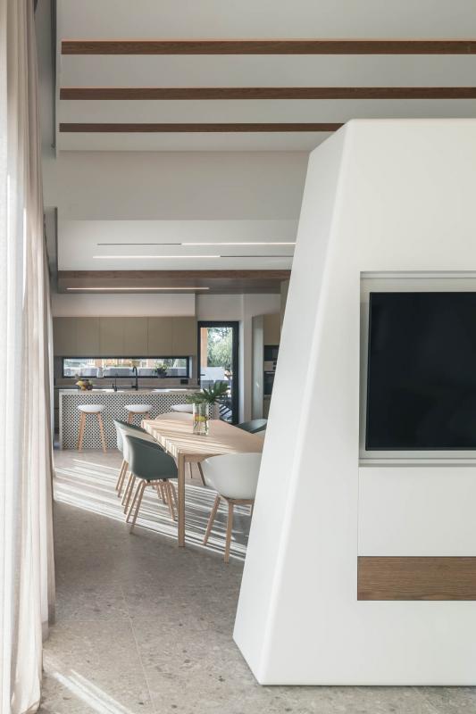 חלל מגורים מקורה מואר ונוח בעל מערכת קירות זכוכית עם גישה ישירה למרפסת בריכה. פינת אוכל ופינת טלוויזיה .