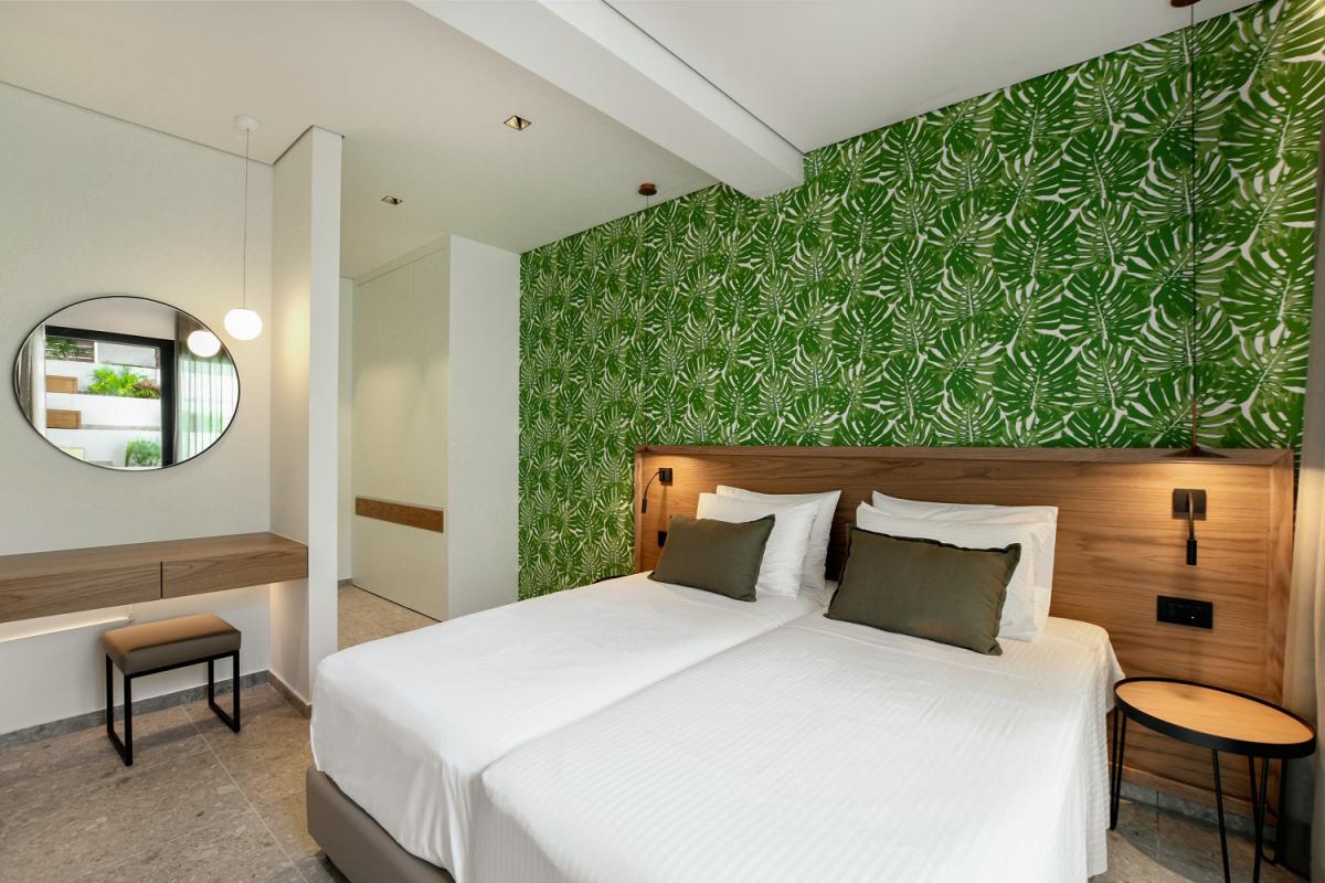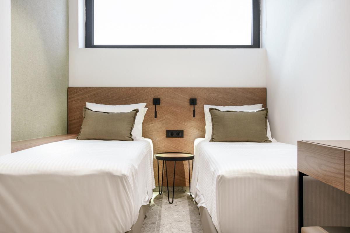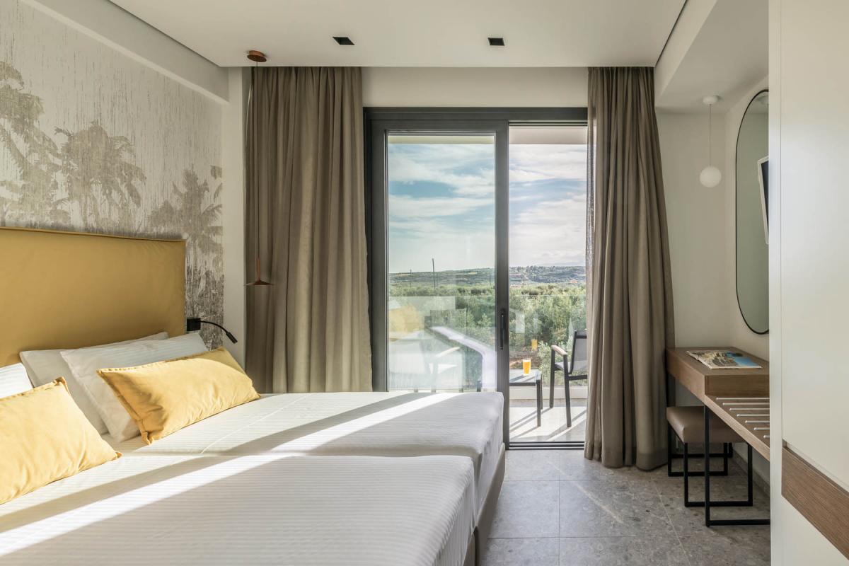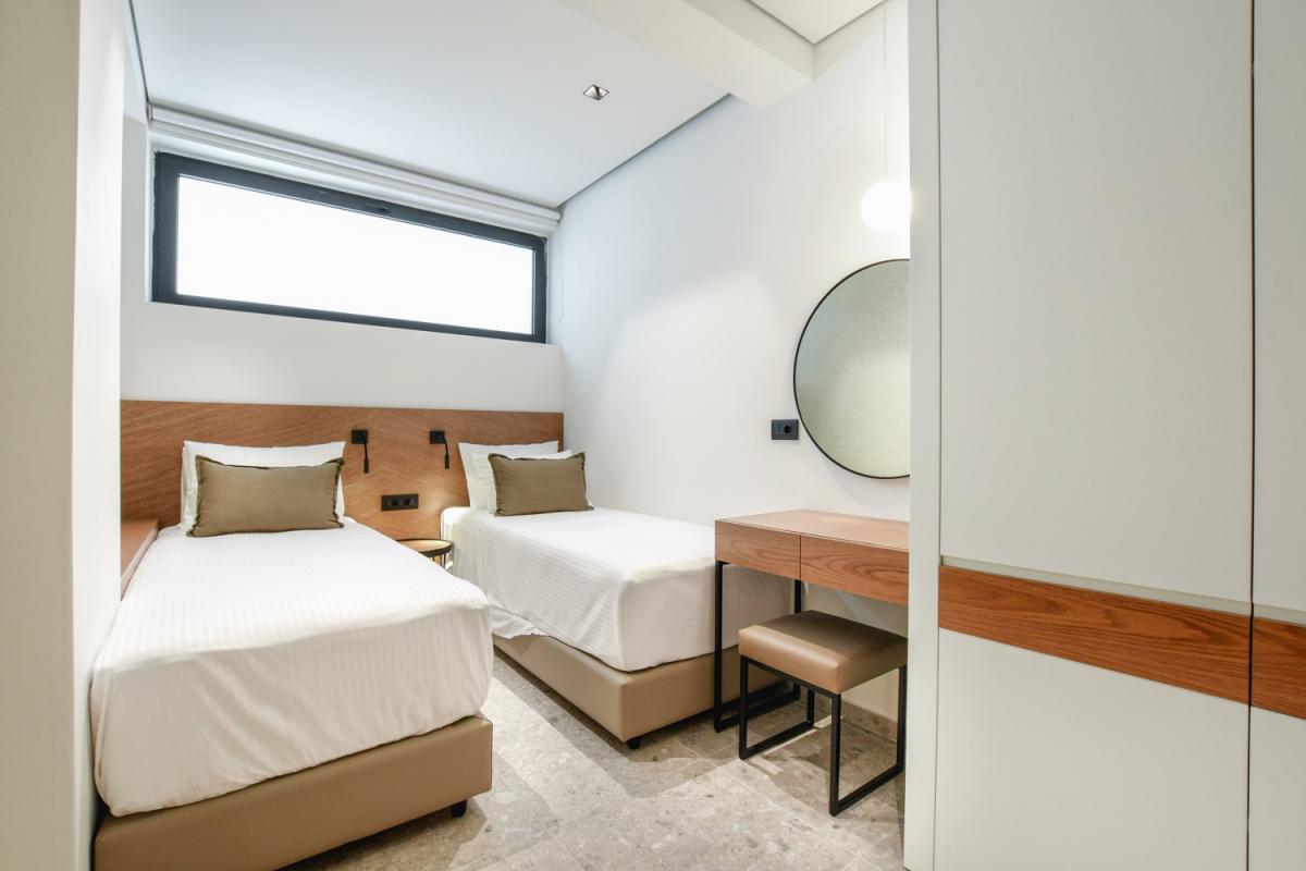 חדר שינה A-6 קומה ראשונה: 2 מיטות טווין (90×200 אינץ' + 90×200 אינץ'), חדר רחצה צמוד, טלוויזיה חכמה, NETFLIX, כספת, שולחן מיזוג אוויר, מרפסת עם ריהוט, נוף לגן הזיתים