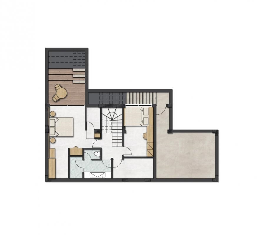 חדר שינה A-5 קומה ראשונה: 2 מיטות טווין (90×200 אינץ' + 90×200 אינץ'), חדר רחצה צמוד, טלוויזיה חכמה, NETFLIX, כספת, מיזוג אוויר, נוף להרים/גן הזית/בריכה, שולחן עבודה, מרפסת עם ריהוט