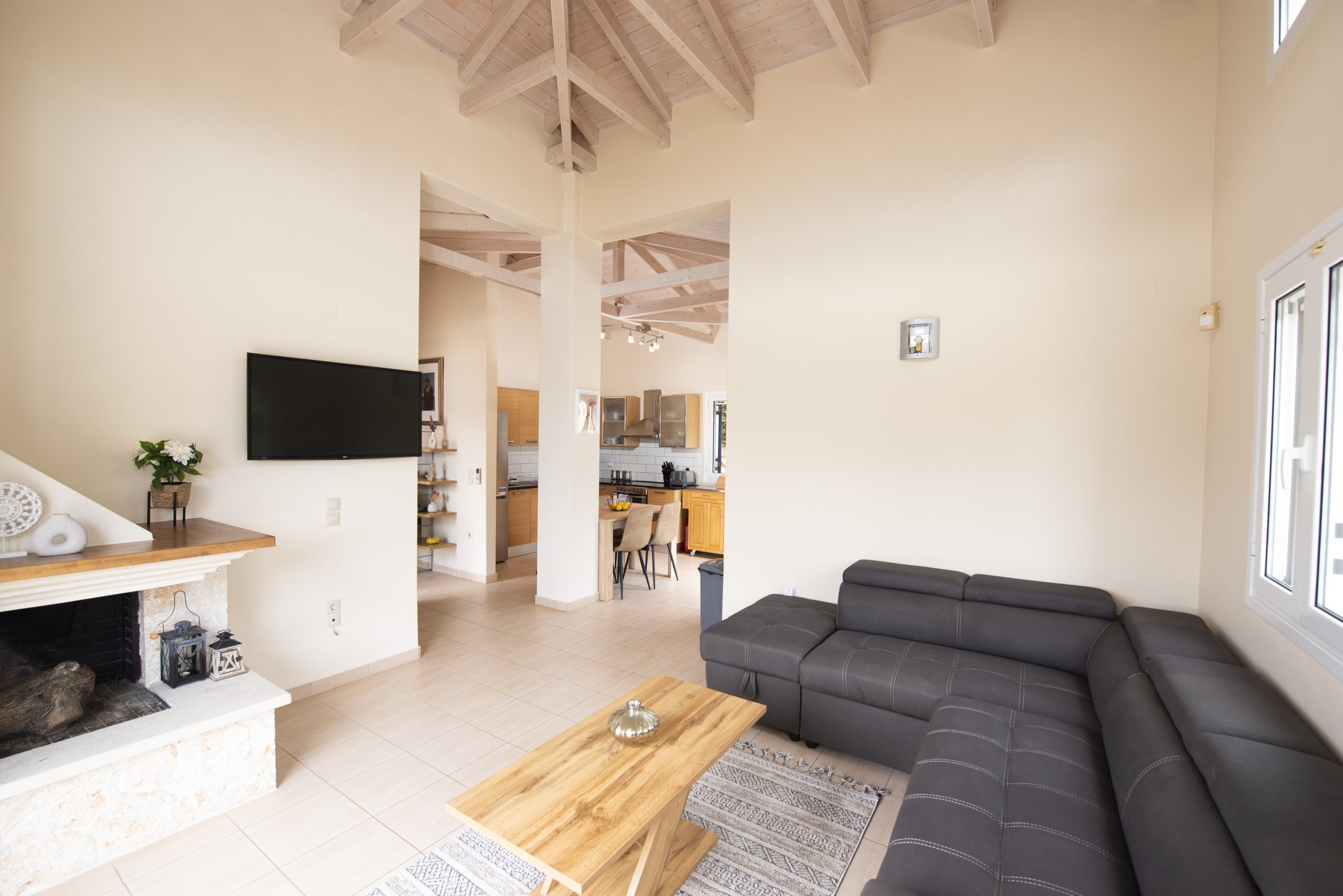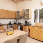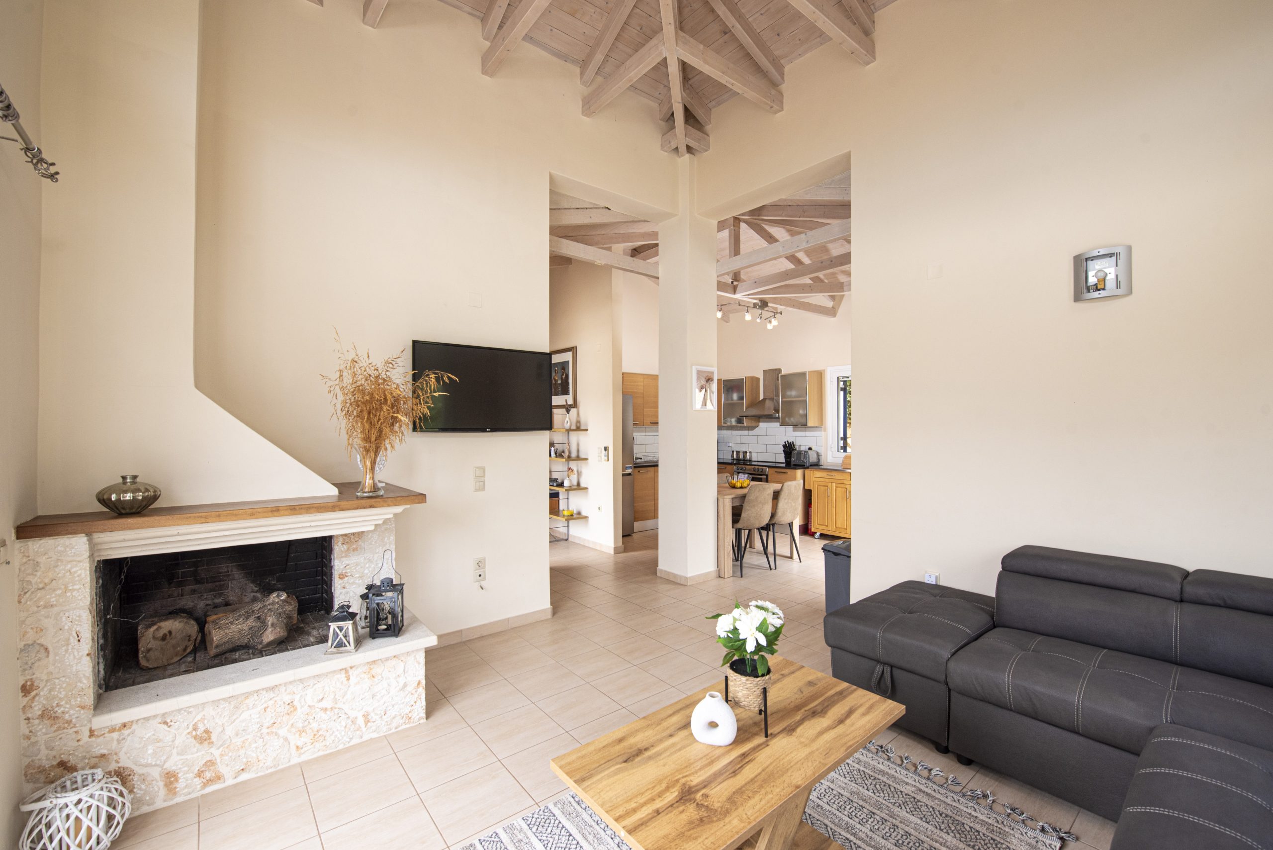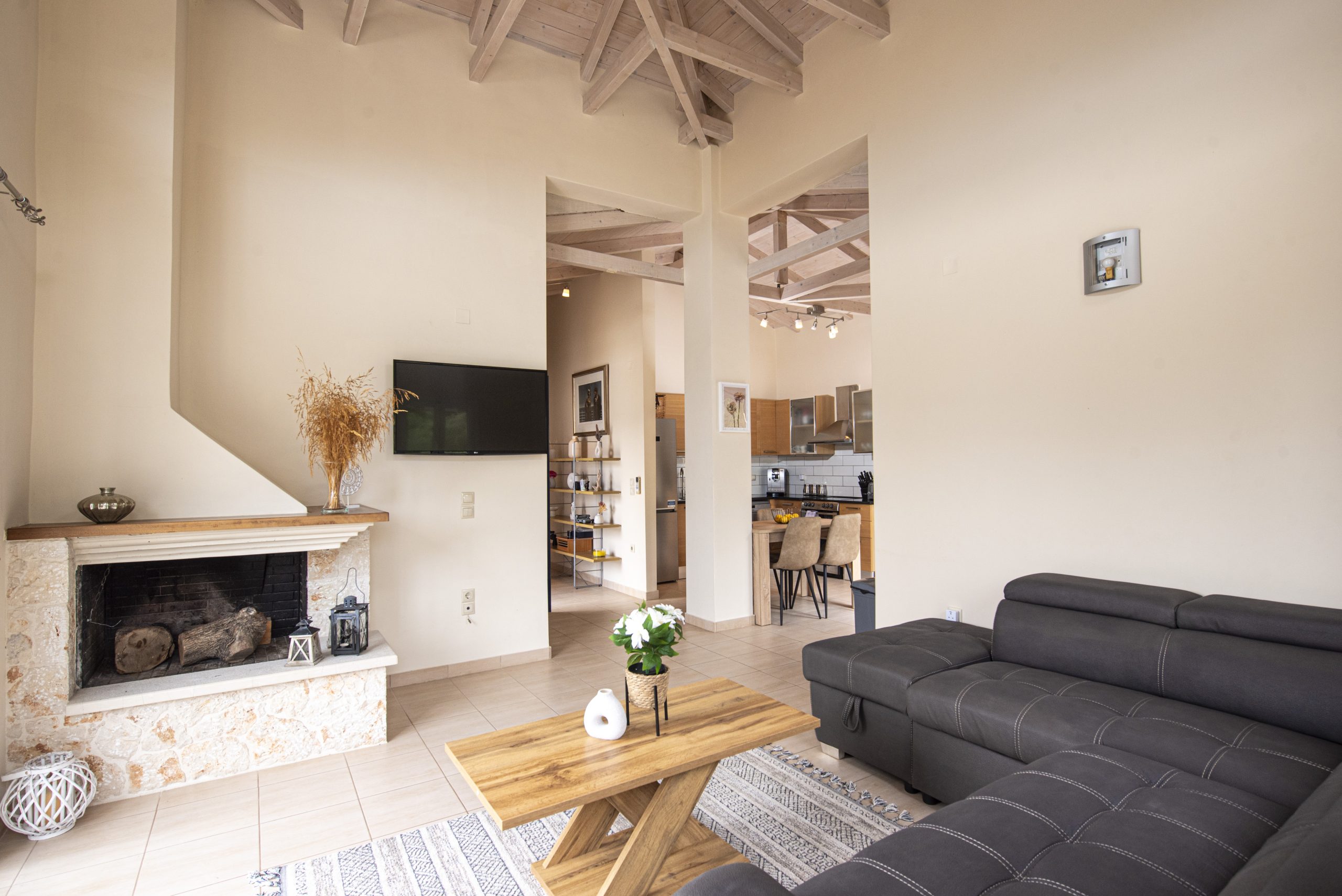 קומת קרקע: חלל המגורים הפתוח המורכב ממטבח מאובזר, פינת אוכל ואזור טרקלין מרווח. תקרת הקורה הגבוהה המסורתית ודלתות חלון הזכוכית ממלאות את החלל באור טבעי עם גישה ישירה לאזור הבריכה הפרטית החיצונית.