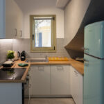 בחלל זה מטבח מאובזר, פינת אוכל ואזור סלון הפונה להרים הירוקים.