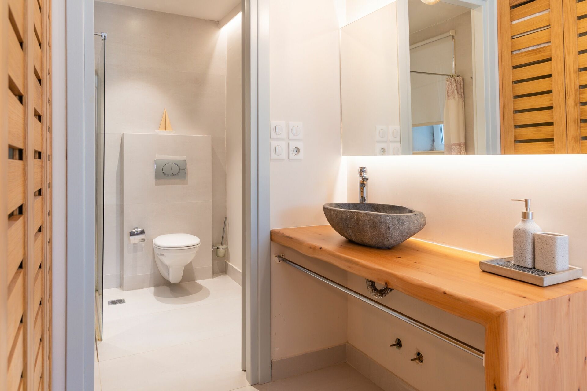 קומת כניסה : חדר שינה זוגי עם חדר רחצה פרטי עם מקלחת; חדר שינה עם 2 מיטות יחיד וחדר רחצה פרטי עם מקלחת