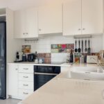 The living area includes a fully equipped kitchen, a sitting area with a sofa bed for a double bed for two additional guests (suitable for children), and a dining table suitable for 8 diners.