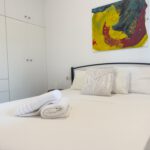 Master bedroom with a double bed that includes a private bathroom, closets, sea view and exit to the terrace with a private sitting area.