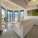 An open and spacious living area with a high ceiling, stunning sea views and large French doors leading directly onto the swimming pool terrace.